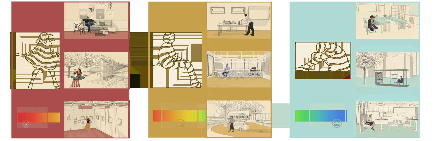 Psychology outlines three types of personality: Narcissism (more showy than introverted)), Ordinary (showy equals introverted) and Self-abasement (showy less than introverted). The different colours represent the different personalities of people, with red representing the narcissist, yellow representing the ordinary personality and blue representing the inferior personality. Here, have observed these three personalities in their lives, recorded their body language, extracted the forms and transformed them into the following design symbols.