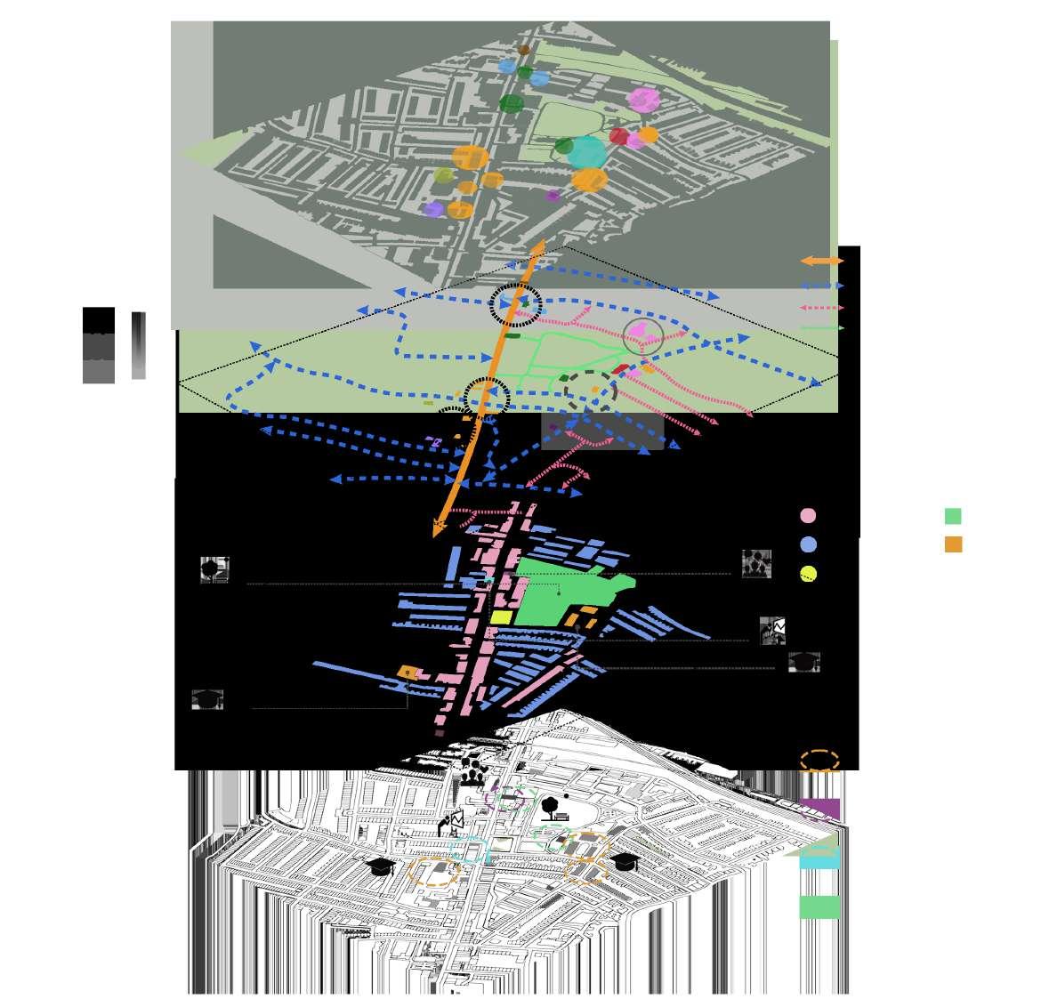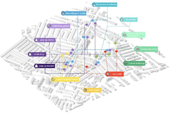 After chossing potential sites that include vacant space、demolished building、community centres、school、retail shops, extend some functional area from Kingsgate into these sites and adaptive reuse. They are divided into different art industries with short-term goals and try to activate community's cultural diversity and improve career support.