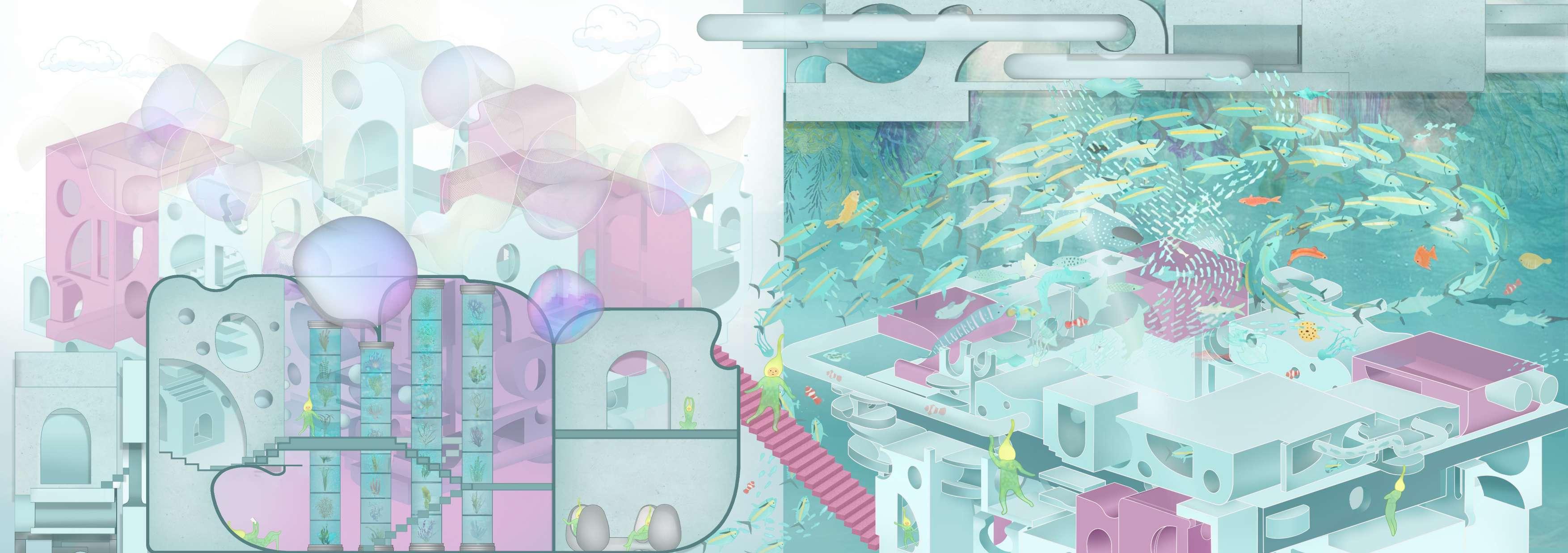 This is divided into two renderings of frontal and inverted perspectives, showing the activity space of people and aquatic creatures. Used to present the thriving atmosphere of people and aquatic creatures in the water.