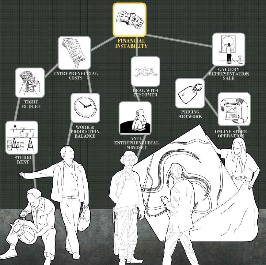 Economic Instability Due to the unstable income, many young practitioners and even multi-year practitioners need to work part-time or full-time to support their artistic dreams. Selling art is the main source of income for artists. Some artists find it difficult to market themselves to clients because they feel that entrepreneurship is contrary to their artistic temperament. Without the help and representation of art galleries, it is difficult for artists to reach more customers and formal sales. Especially for some young artists, they are less commercially aware and unable to properly price their works.