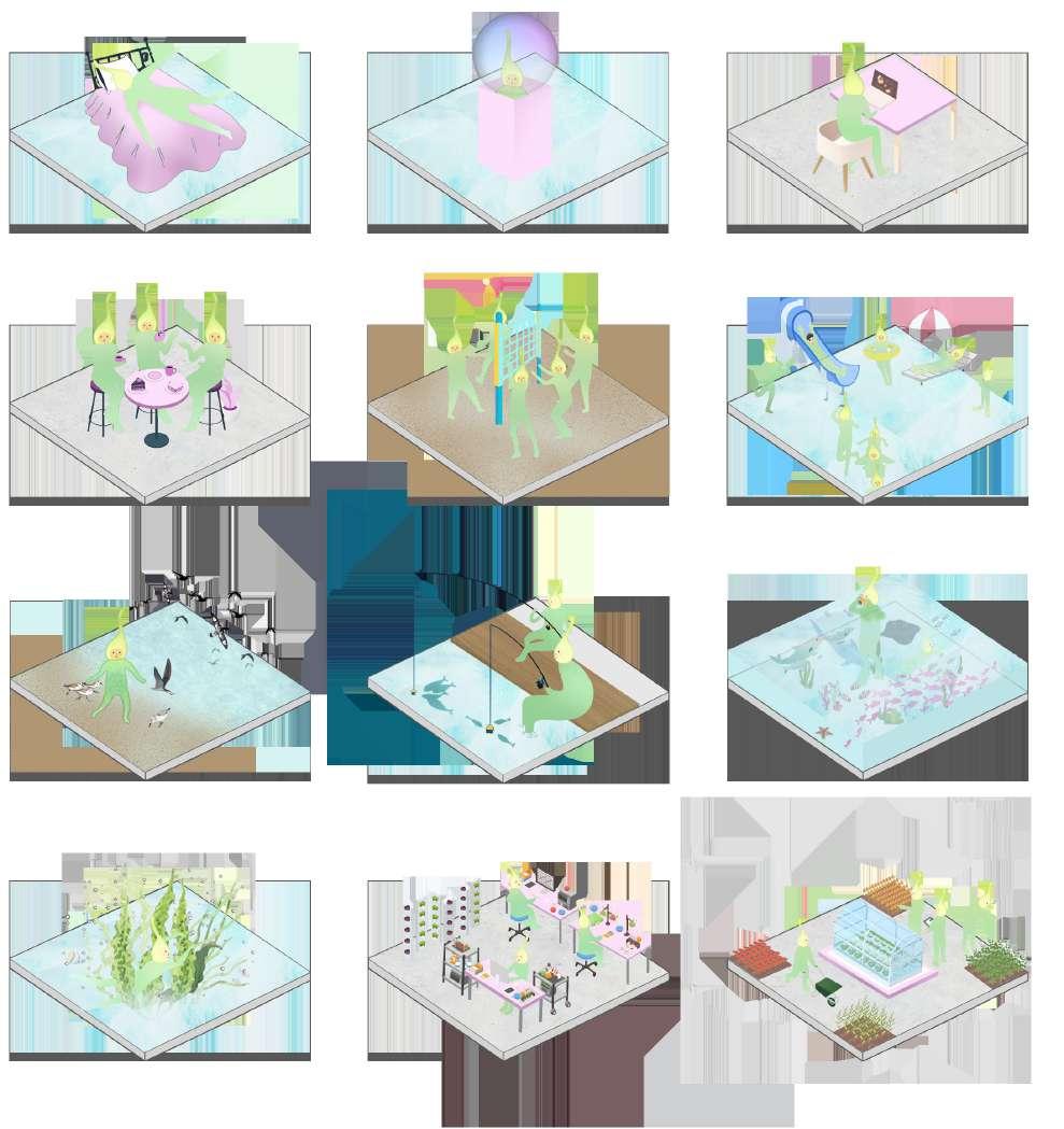 I used algae as a medium to create a space for human activities, and at the same time concretize human behavior needs. Mainly divided into people’s own behavioral needs, group behaviors of people, interactions between humans and animals, interactions between humans and plants.