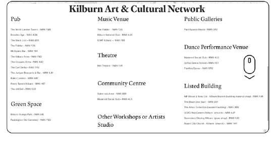 This website serves the residents of Kilburn. They can make full use of website to search for cultural infrastructure in their local community and enrich their leisure life.