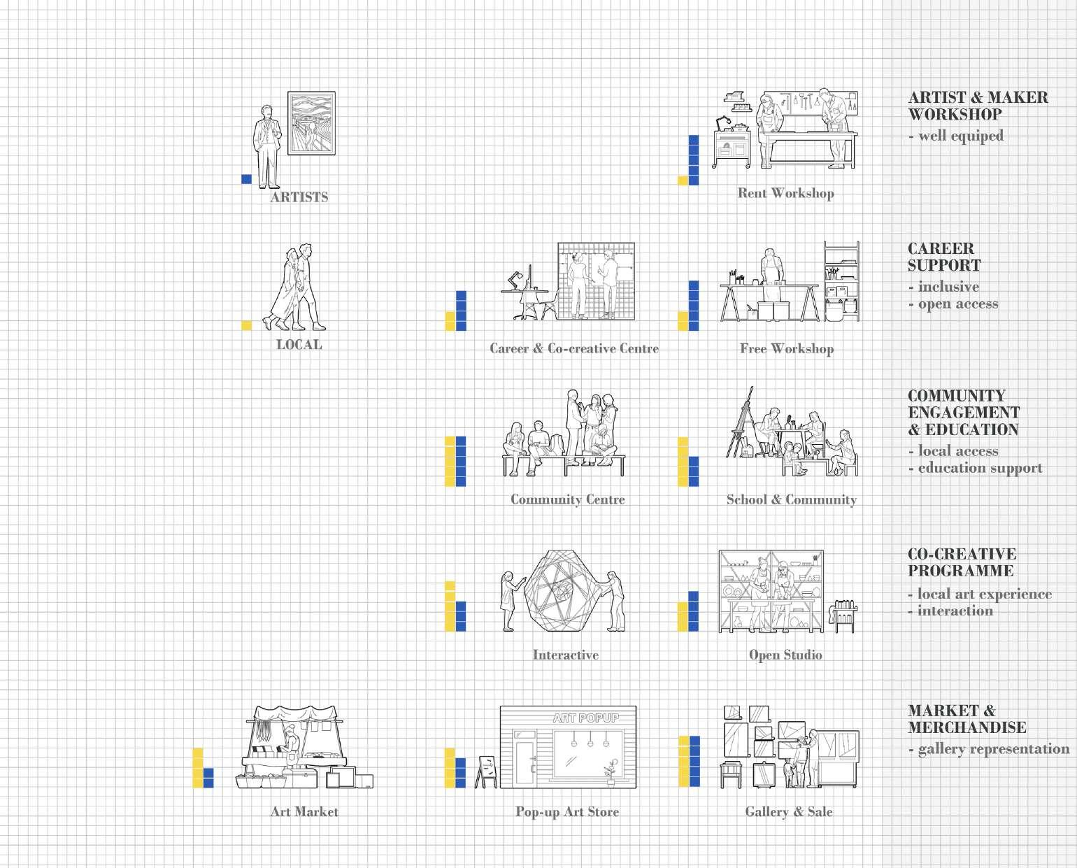 Based on a survey of artists' needs and dilemmas, five categories of spaces have been compiled: Artist & maker workshop, Career support, Community engagement & education, Co-creative programme, Market & merchandise. Some of these spaces are only accessible for artists and some are public friendly. Combined with the results of the questionnaire survey of the Kilburn residents, the level of demand for these spaces by the public and artists was summarized and will be used as the basis for the actual layout of the venue.