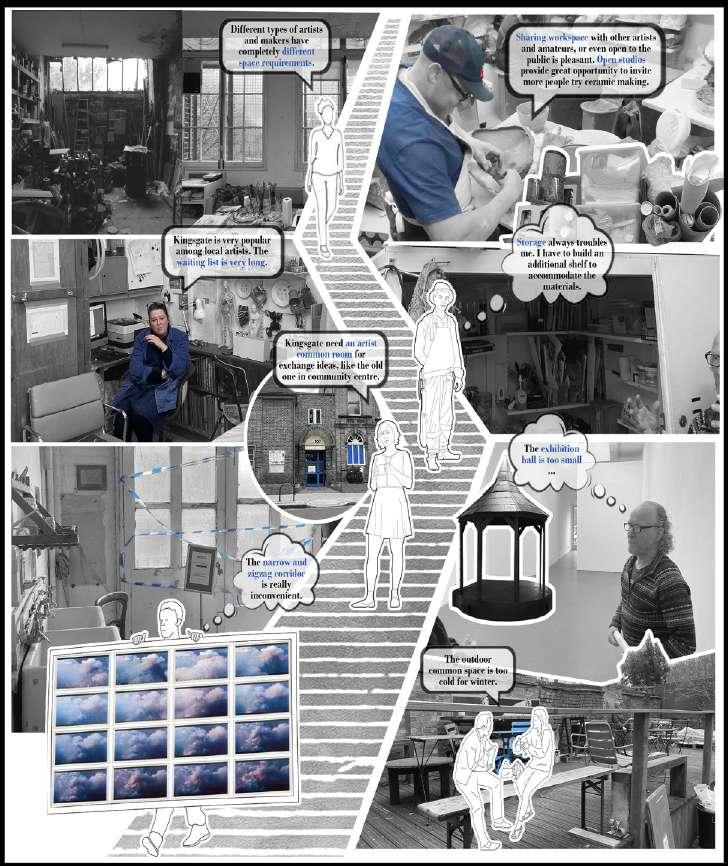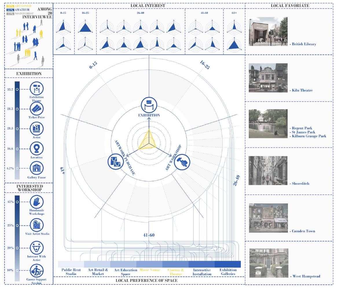 Based on the conclusion from the survey of artists, 20 kilburn residents were interviewed about the frequency of exhibition visiting, the annual spending on artworks, and their interest in art workshops. They ranked exhibitions, art purchases, and then workshop participation. Then, detailed research was about their focus on exhibition choices, the types of workshops they were interested in, and the their choices of favoriate venues. As co-creators, public input on the interaction of functional spaces in Kilburn is also important to design decisions.