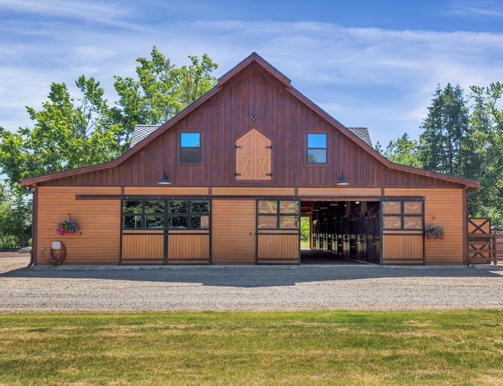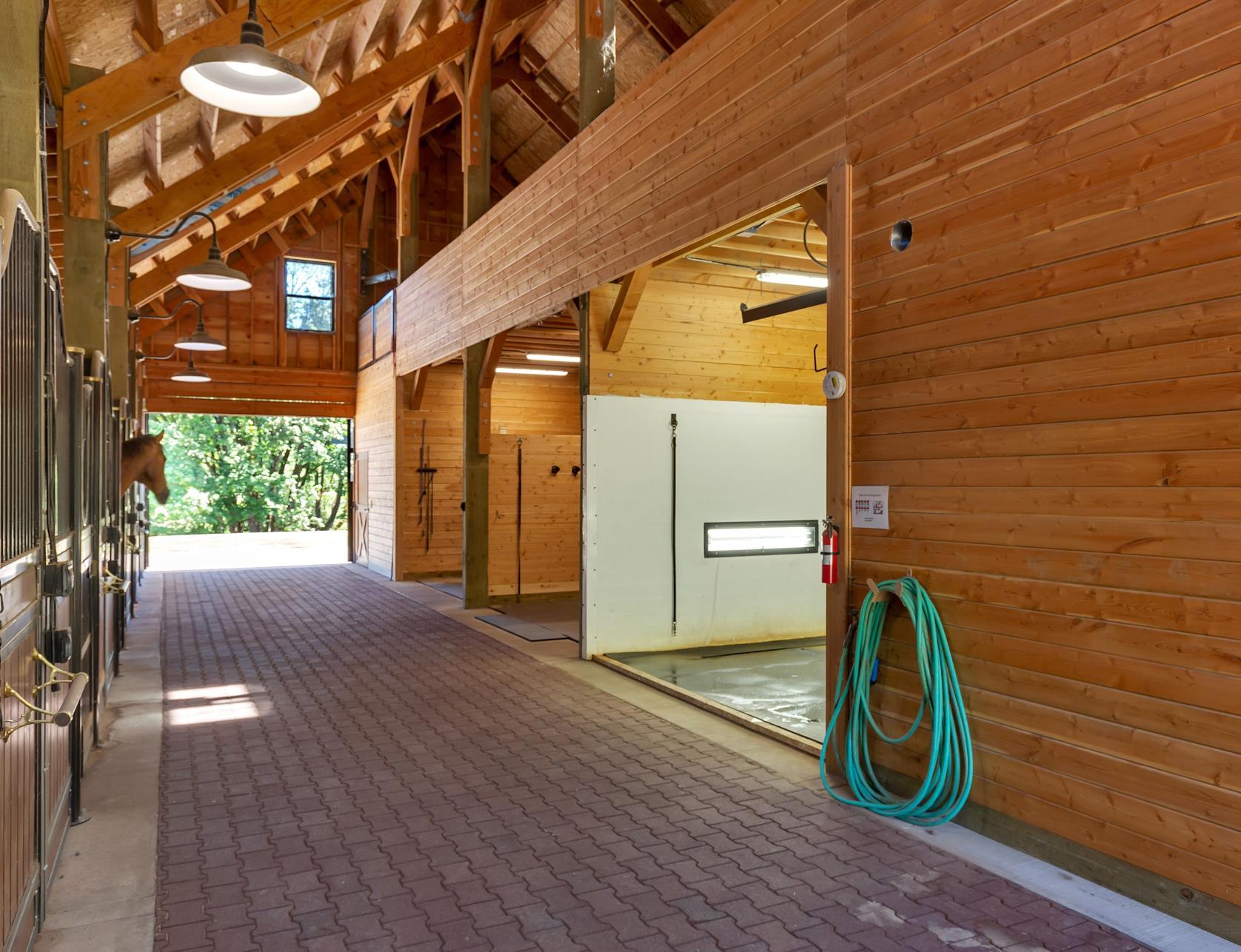Equestrians, prepare to revel in the gorgeous stable! Thought and materials with the health, wellbeing and enjoyment of horse and rider culminate perfectly. 6 over-sized European stalls with attached mud-free runs. Note the expertly constructed metal encasement of any exposed wood surfaces prone to equine destruction. Safety and slip resistant dog-bone aisleway, Nelson waterers, corner feeders and fans. Cross-ties, heated wash rack, tack room, grain room with vet sink and mediation fridge with proper restroom. Plentiful hay loft and additional blanket or show gear storage upstairs. Over 24 acres of useable pasture for turnout, grazing or trail riding even down to the water’s edge.
