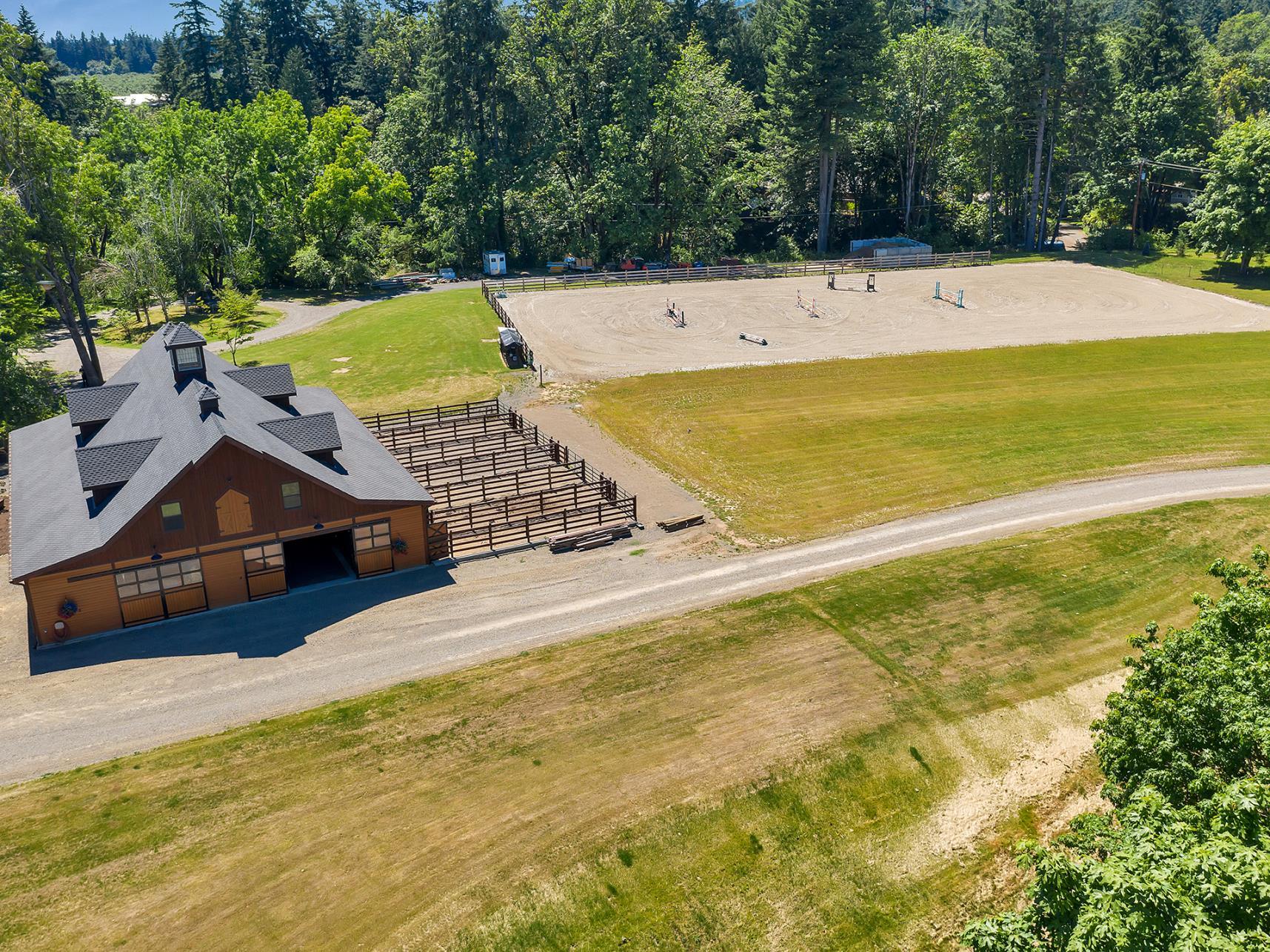 All-weather, 120 x 240 GGT footing outdoor arena installed with exacting specifications from site prep, slope, base, and materials. An arena to last a life-time against the Northwest rainfall. Foresight to cover and enclose accounted for and easily completed or simply enjoy riding outdoors with the feeling of wind and freedom.