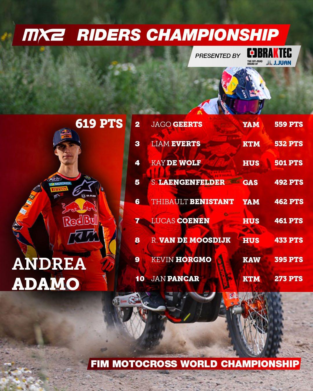 Jago Geerts out, Andrea Adamo was able to regain a 60-point lead in the Championship. Currently third, Liam Everts could take 2nd place at the Grand Prix of Sweden if his compatriot is still convalescent. Same factory but different injury, Thibault Benistant was taken 5th place by a Simon Laengenfelder who already has his sights set on 4th position from Kay de Wolf,