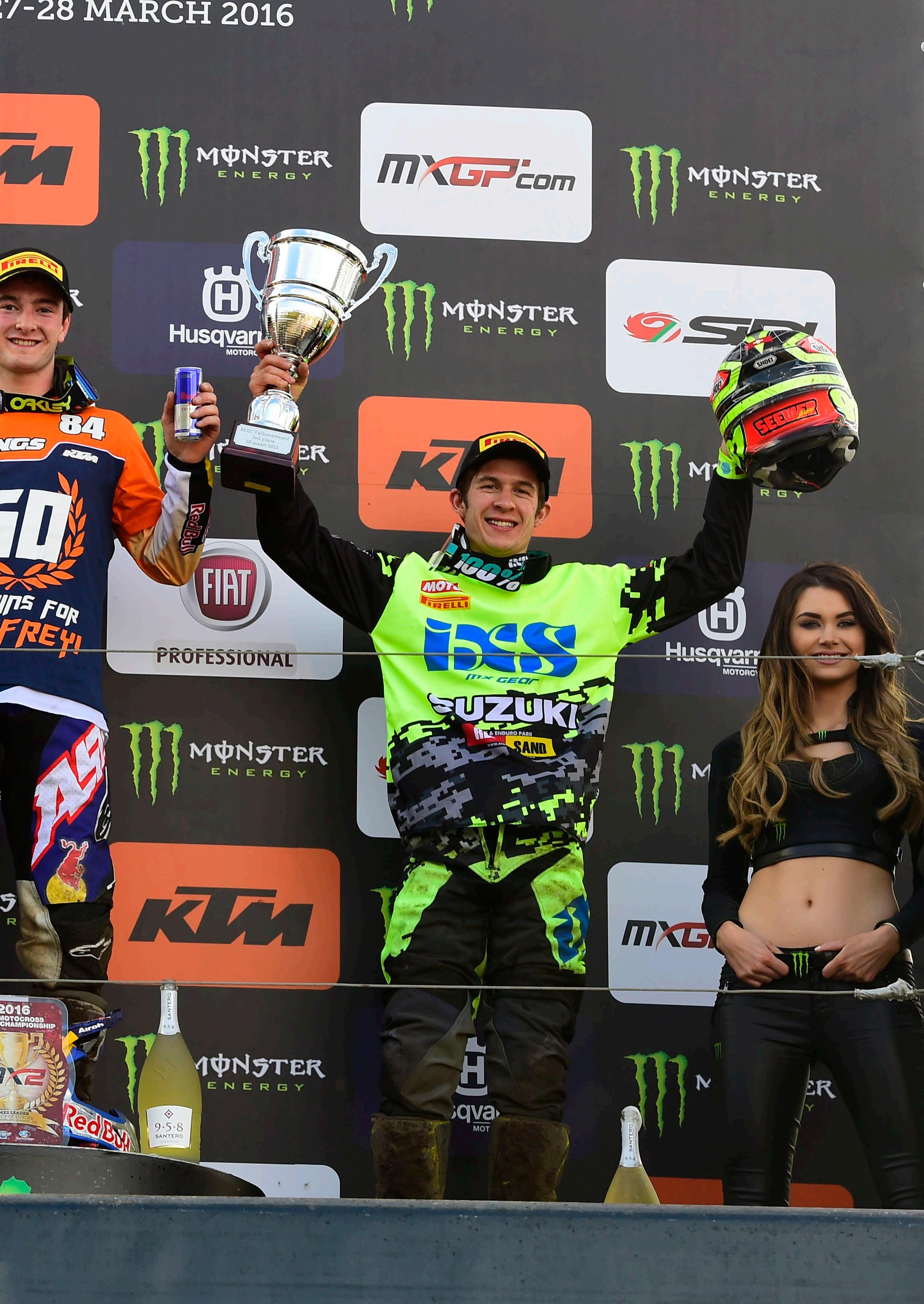 the pack in difficult conditions in race two to secure 10th, which was enough for his first MX2 podium as well.