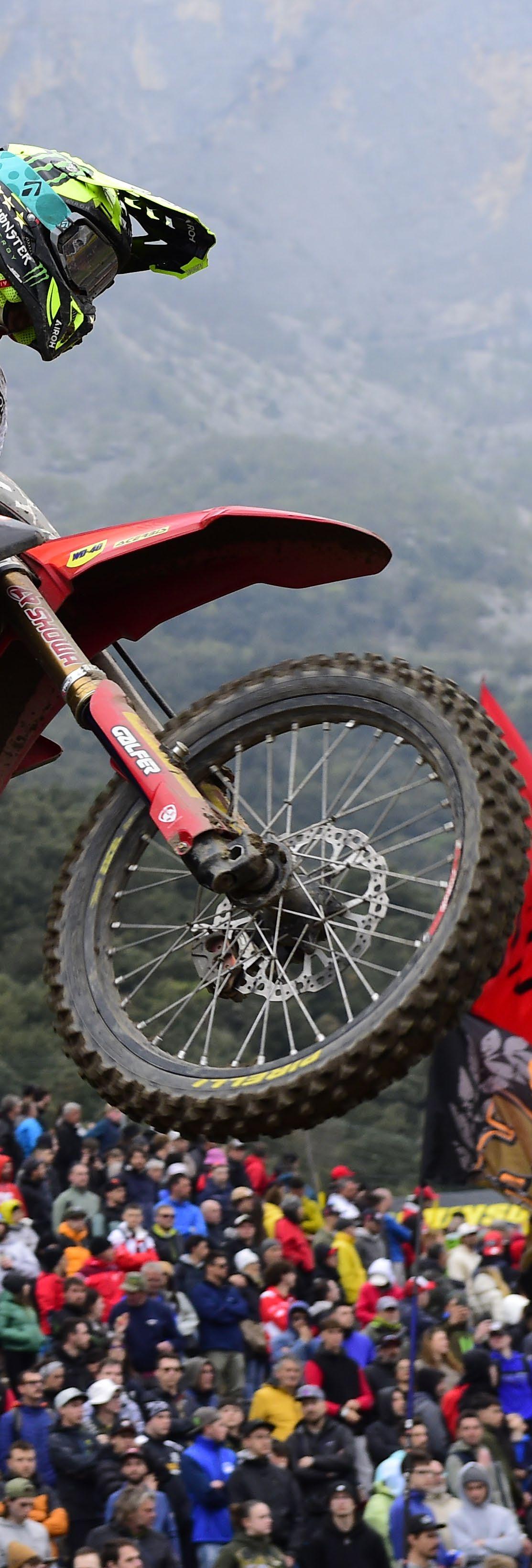Round three at Saint Jean d’Angely in France, and Febvre registered 2nd overall, but more significant perhaps, was that this result triggered an impressive run of fourteen consecutive podiums, with his first overall GP win coming next time out in Sardinia’s deep sands of Riola Sardo. Backto-back wins in Spain (Lugo) and France (Ernee) at rounds eight and nine meant he left Ernee with a 47-point lead over his closest rival. After his next win in England, round 12, his lead was still a respectable 32-points. However, the real test came after the MXGP of Flanders, at Lommel, Belgium where Febvre’s lead was now down to just 9-points.
