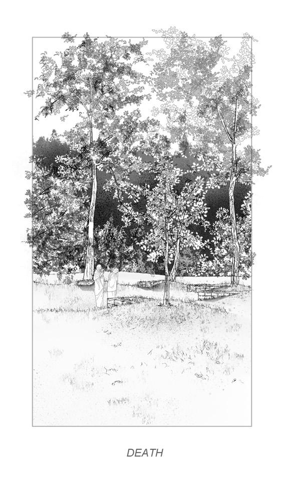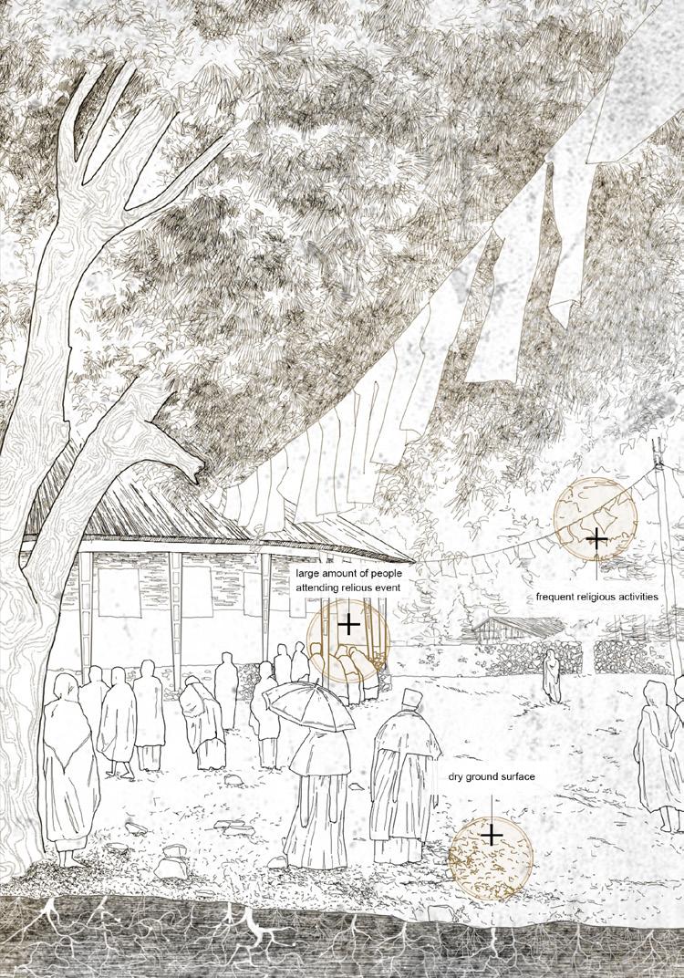 In Ethiopia, climate change and excessive reclamation efforts have turned once-fertile land barren. Despite ecological degradation, the site retains potential for religious and cultural significance, as well as mushroom habitats. The Orthodox faith inspires a communal routine blending pursuit of an imaginary Eden with forest conservation, giving rise to the Eco Chapel concept.