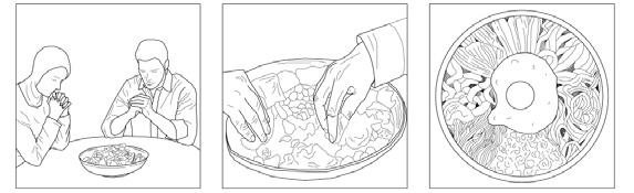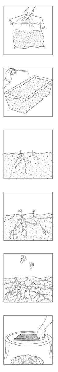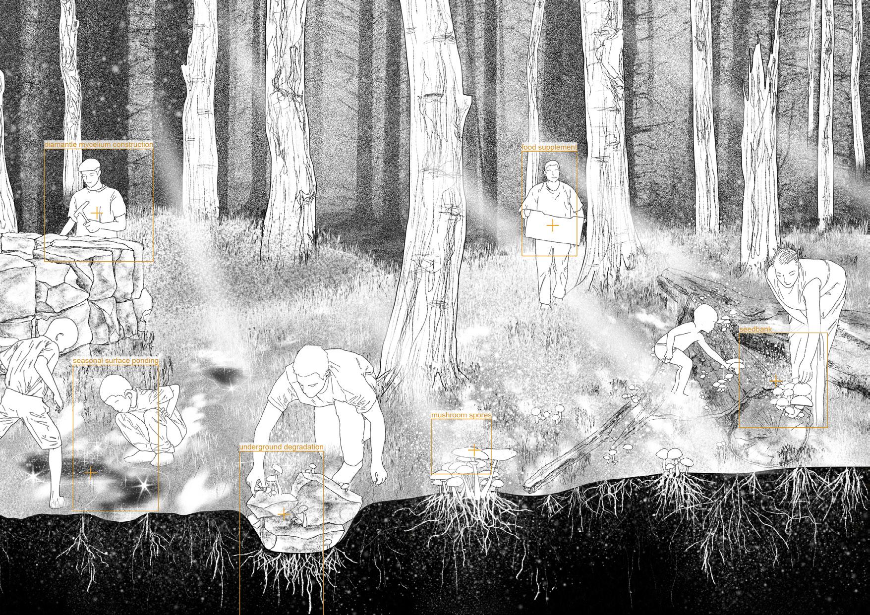 Mushroom cultivation, adapted to seasonal precipitation rhythms, recycles organic waste and supplies the Chapel with plastic mycelium material, serving various needs. Mycelium functions as a versatile building material, including bricks, seats, and coffins in the dry season, while degrading in the wet season to enrich soil for new mushroom cycles. This mycelium circulation aligns with regional climate characteristics, fostering communal life and bridging human activities with ecological remediation.