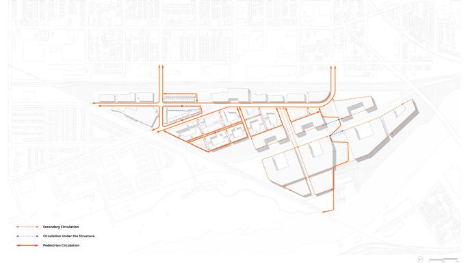 The proposed biotech manufacturing campus in Kingsessing aims to reshape the image of the life science industry as transparent and publicly engaged. This will be achieved by carefully orchestrating circulation to facilitate smooth industry operations while ensuring harmonious coexistence with public access. Such an approach fosters direct interaction and knowledge exchange between the neighborhood and biotech companies, thereby promoting a positive impact on the community.