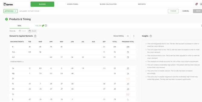Using soil, water and tissue data combined with proprietary algorithms and research backed crop models, Qortex will generate fertility programs with block level precision.