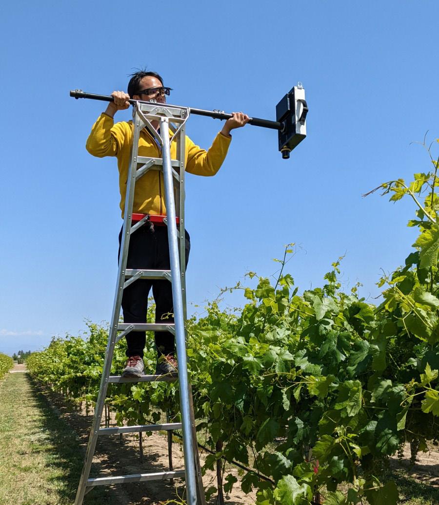 Dr. Alireza Pourreza collecting grape leaf hyperspectral reflectance using a backpack spectrometer equipped with a leaf clipper and looking at the measurement in real time (all photos courtesy A. Pourreza.)