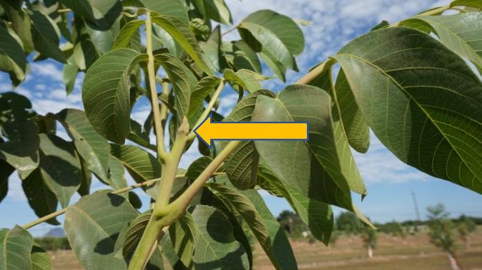 Figure 1. Very limited leaf-out in April 2019 in a Chandler orchard near Gridley, Calif. (photo by L. Milliron.)