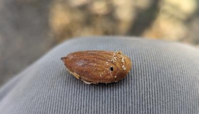 Almond with hole chewed through it by carpophilus beetle (photo courtesy J. Rijal.)