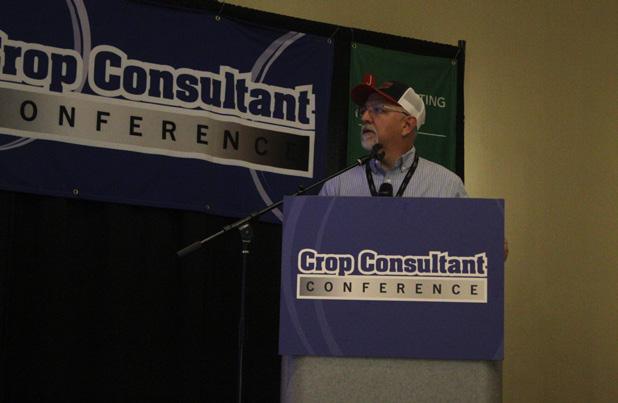 Stephen Vasquez, executive director of the Administrative Committee for Pistachios, emphasized the importance of considering both short- and longterm impacts of fertilizer decisions while moderating a panel on potassium in orchard crops at the Crop Consultant Conference (photo by K. Platts.)
