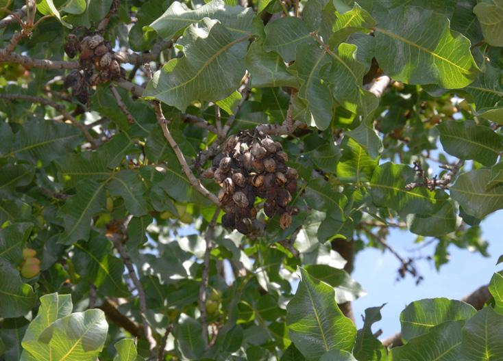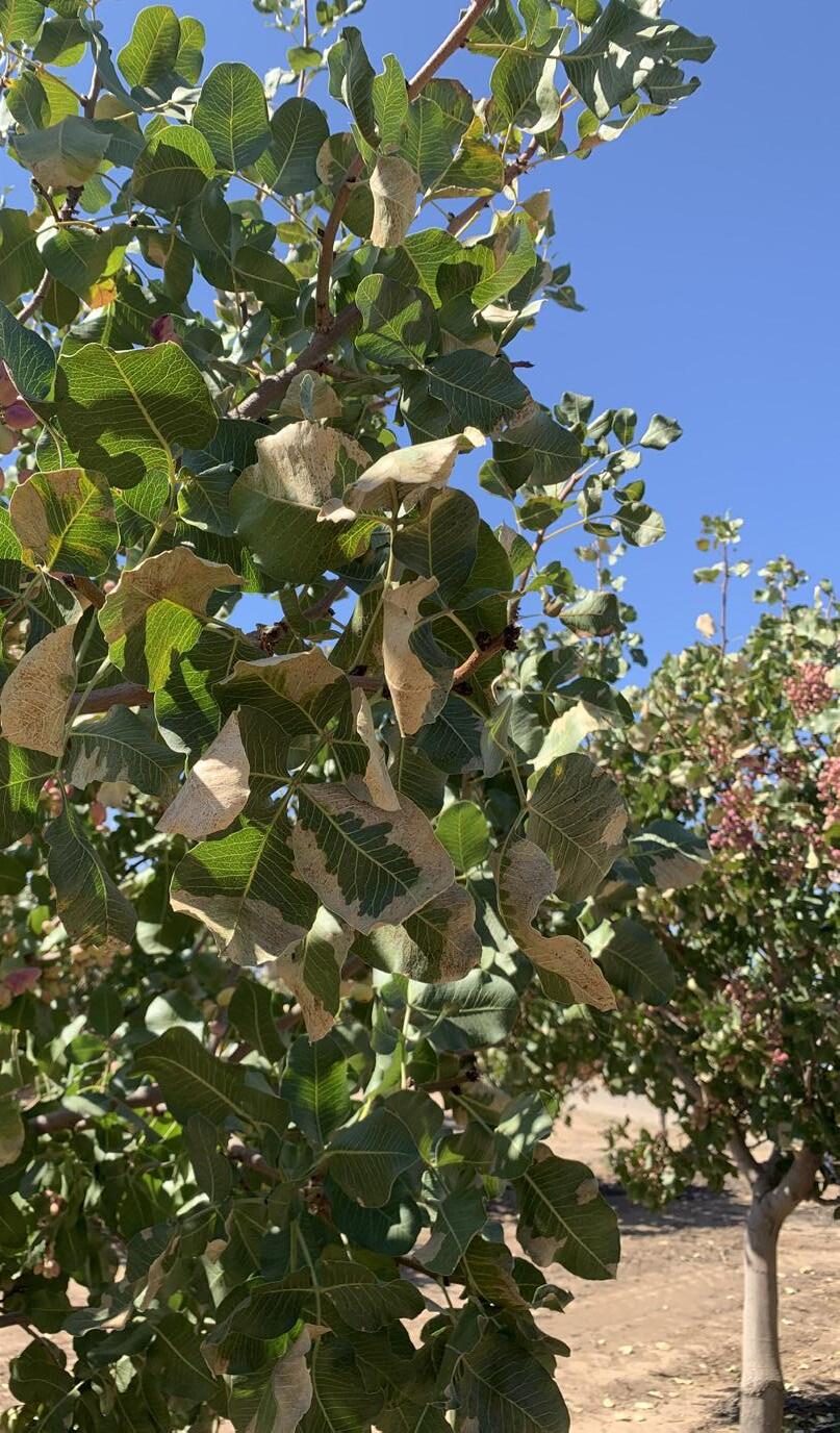Some signs of potassium deficiency in pistachios (photo by M. Culumber.)