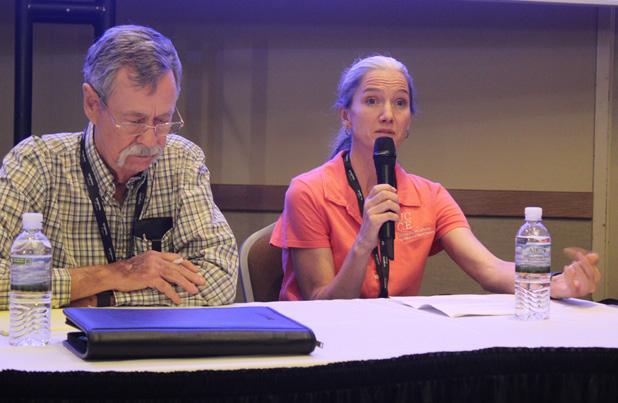 UCCE Farm Advisor Mae Culumber speaks about potassium in orchard crops, alongside Hronis Inc.’s Paul Giboney, during a panel session at the Crop Consultant Conference in September (photo by K. Platts.)