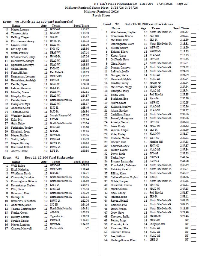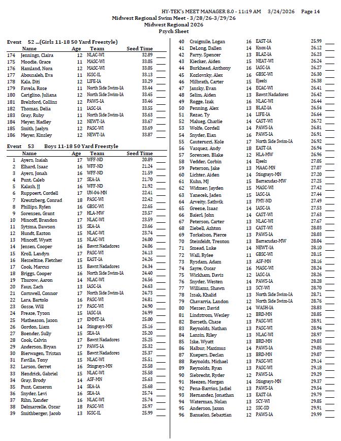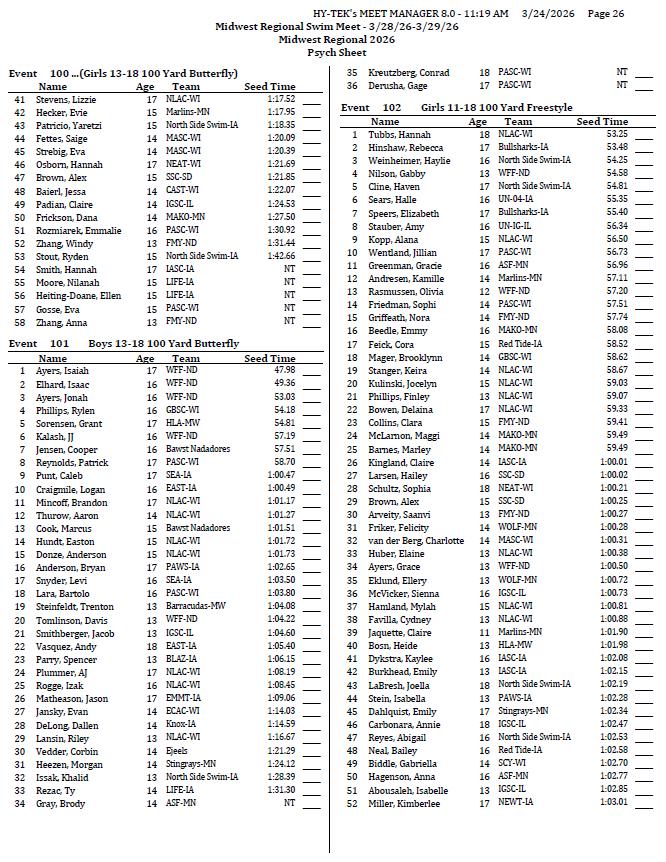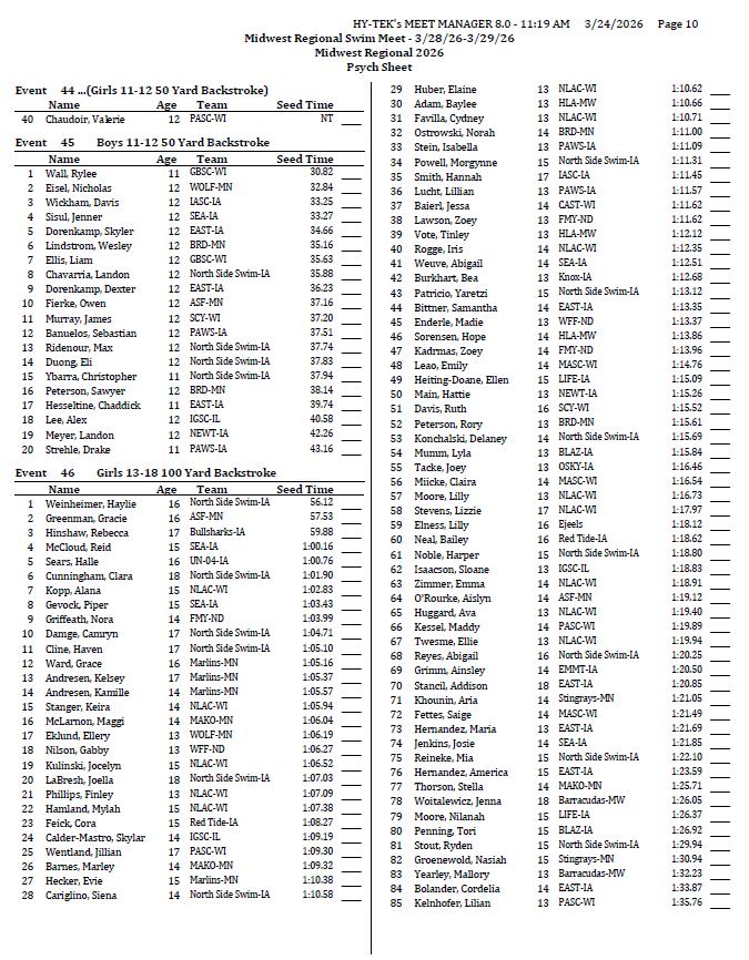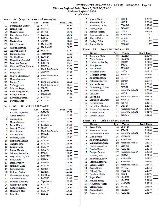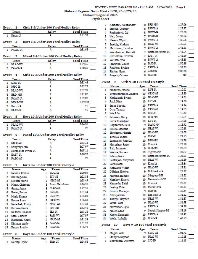 On behalf of the Minnesota Youth Athletic Services (MYAS) and the Spring Lake Park High School Swim Team, we welcome you to the 2026 Midwest Regional Swim Meet. We look forward to another great event. We have athletes competing from eight different states this weekend!