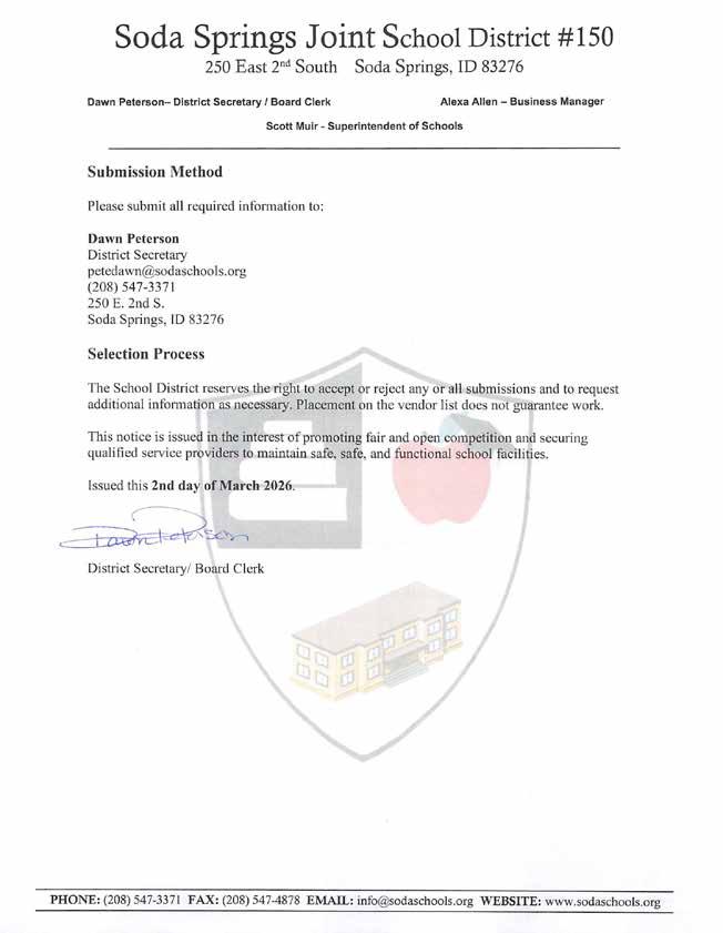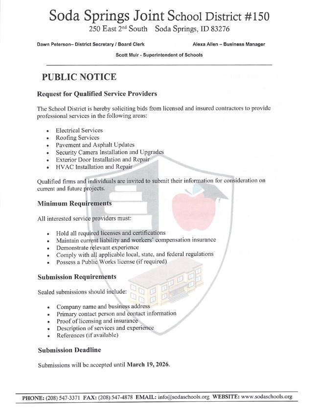 The Soda Springs School District has received a significant boost to its longterm infrastructure plans following the approval of its application to the Public-School Facilities Cooperative Funding Program. On January 7, 2026, the state’s review panel formally approved $7,941,343.00 in funding to address several highpriority facility concerns. This money can only be used for facility improvements.