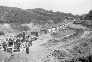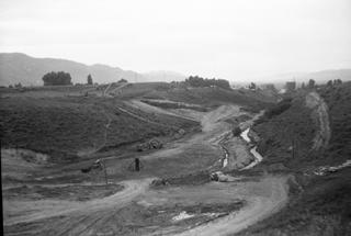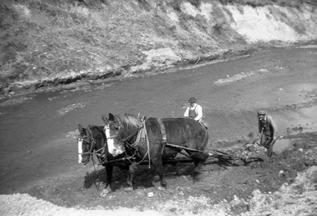 place the old water wheel, so Junius began constructing a bigger and more efficient one. So, in the spring of 1948, work began. Dad (Edward) and I were the first to turn a shovel of dirt toward the building of the dam. One day Dad asked me if I would like to go with him and see where the reservoir was to be built. Standing in the bottom of that gully that day, it was hard to imagine just what was going to take place. Dad and I took out an old flume that had for years diverted the water for irrigation purposes. The next day one of Marion’s big bulldozers showed up, and the work began. The first job was to get all the sand and gravel pushed out of the bottom of the ravine. This was a bigger job than Marion had anticipated. The sand and gravel mixed with water were chewing up the rollers on his bulldozer, so Dee Cameron’s team and scraper were brought in to do the job. (Once the gravel and sand were scraped out Marion’s heavy equipment took over.)