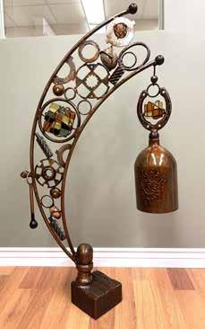Doug Adams has donated another of his one-of-a-kind metal bells for the live auction. Metal lacework is accented by colored stones with a bell hanging from the tip of the intricate metal stand.