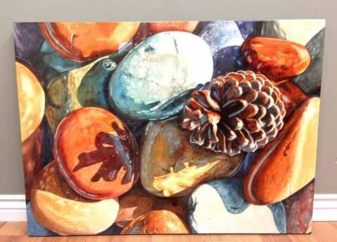 Dianne Adams also has donated one of her lovely watercolors for the live auction. Brightly colored stones surround a pine cone for a beautiful painting that would enliven any home or office.