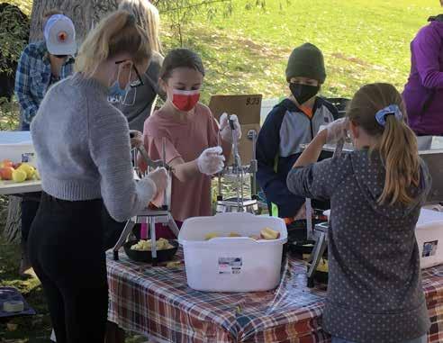 Teachers, parents and students work together to make apple cider at Wasatch Charter School’s 2021 Har vest Festival. (Heather Lawrence/City Journals)