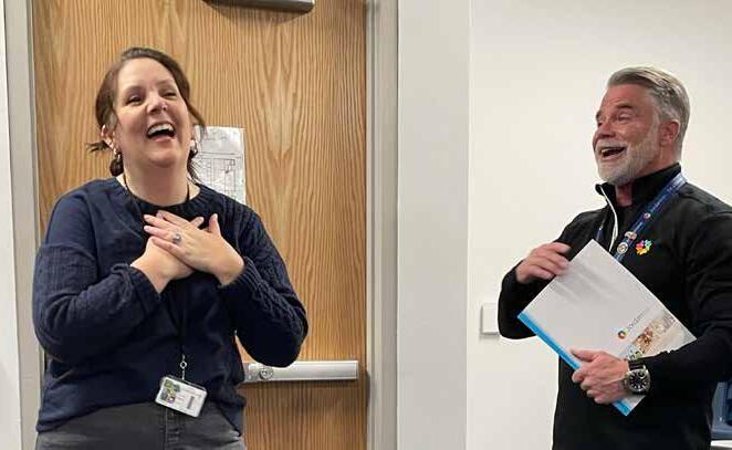 Bingham High teacher Andrea Call was surprised when Jordan Education Foundation Executive Director Mike Haynes congratulated her as Bingham’s Outstanding Educator of the Year. (Julie Slama/City Journals)