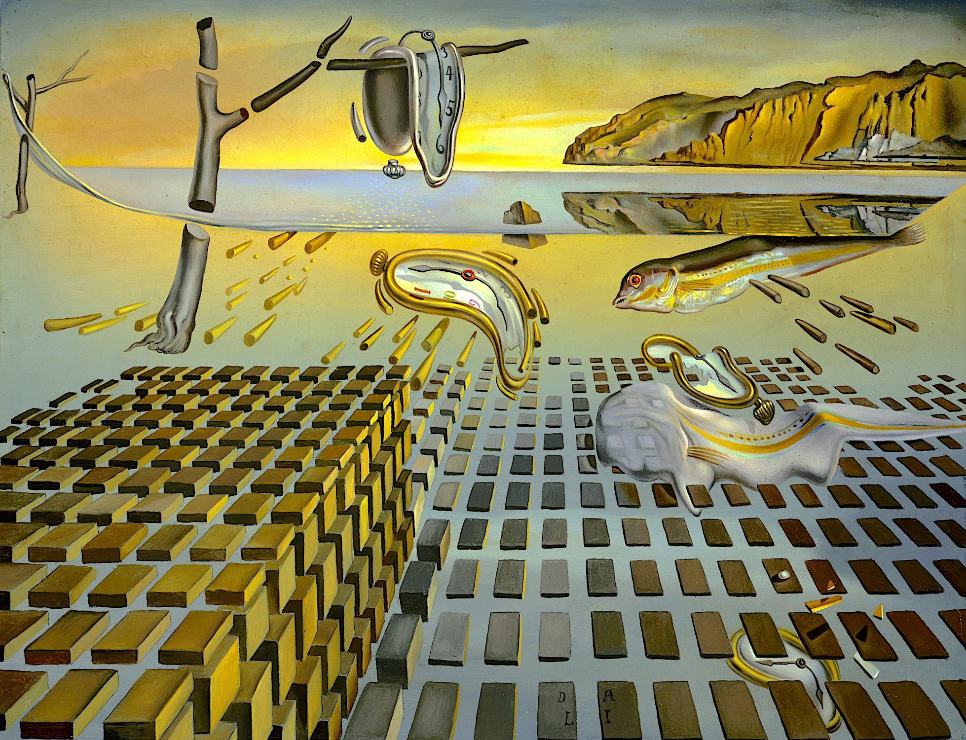 Una de las obras más icónicas de SalvadorDalíes “Ladesinteracióndela persistenciadelamemoria”. Dalí creó estaobraen1954,repasandosuanterior obra maestra “La persistencia de la memoria''. En esta obra, el paisaje se inundacona ua.Enelprimerplano,hay muchosbloquesdemateriaquenoestán tocándose y detrás de los bloques hay otros en orma de misil. En el clásico estilo de Dalí, esta obra tiene cuatro relojes derretidos. Finalmente, un elementoimportanteparaestaobraesel pezenelladoderecho.