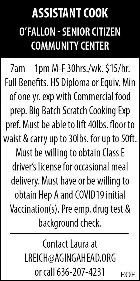 Community Action Agency of St. Louis County is in need of volunteers to stock shelves, sort food shipments and pack bags for Food Pantry Clients Monday through Thursday from 8 a.m. until 3 p.m. Two to four hour shifts are available. If you are interested, please contact Cheryl Piece at 314-446-4440 or cpiece@ caastlc.org for additional information.