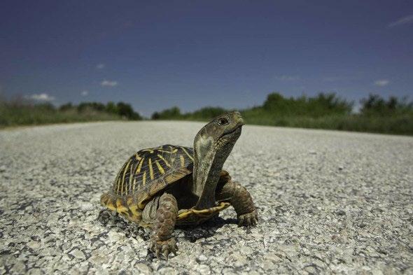 Turtles emerge from their burrows and begin the hunt for food and mates during warm and wet conditions, which can lead them to cross roadways, oftentimes resulting in their death. Thousands of box turtles are killed every year by vehicles.