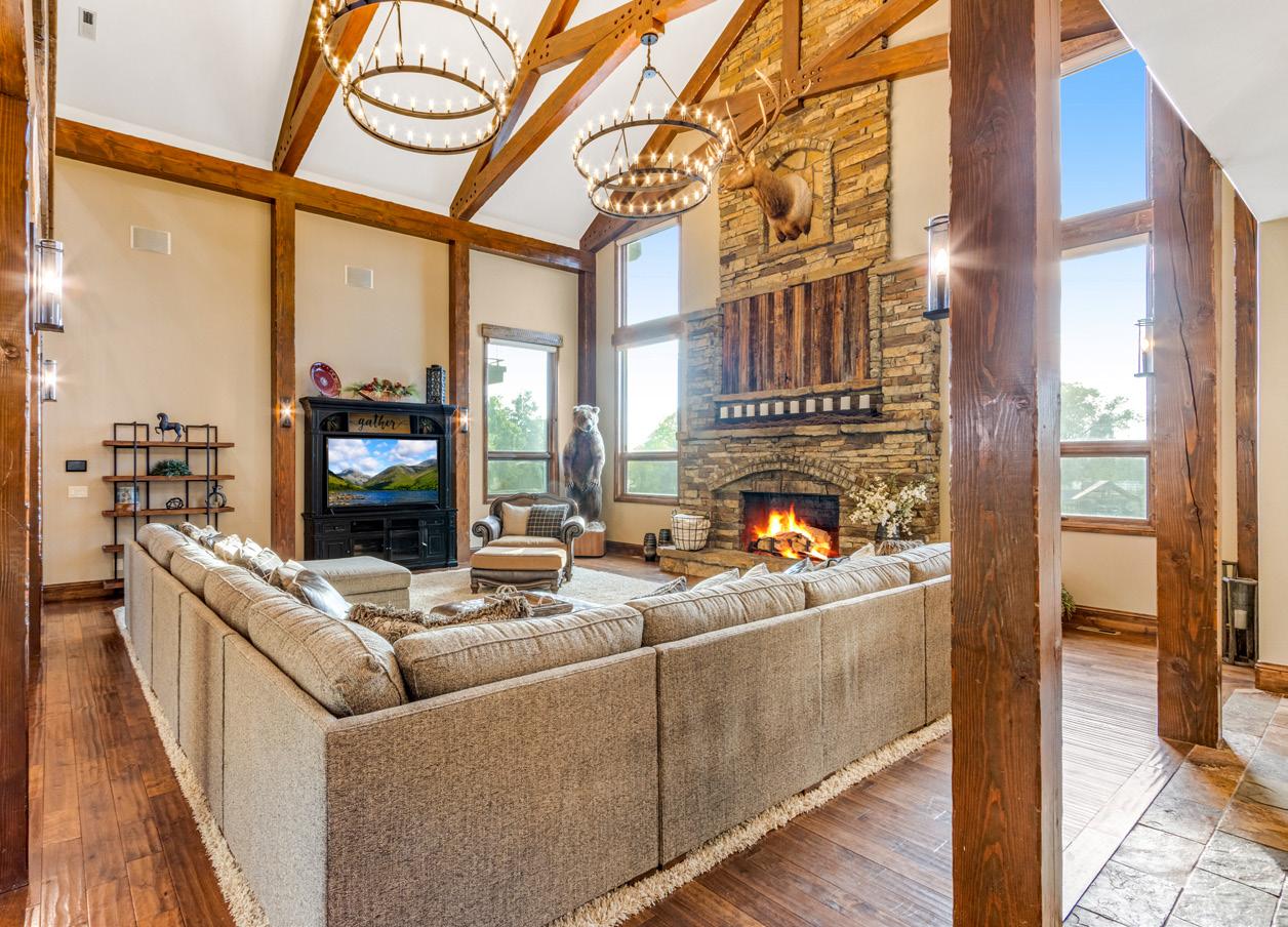 • Expansive family room features floor to ceiling stone wood burning fireplace, mantle, 10 9’X9’ support beams, 6 sconces, expansive vaulted ceilings with added trusses and 2 circular chandeliers. Cable wiring located behind old barn wood above fireplace