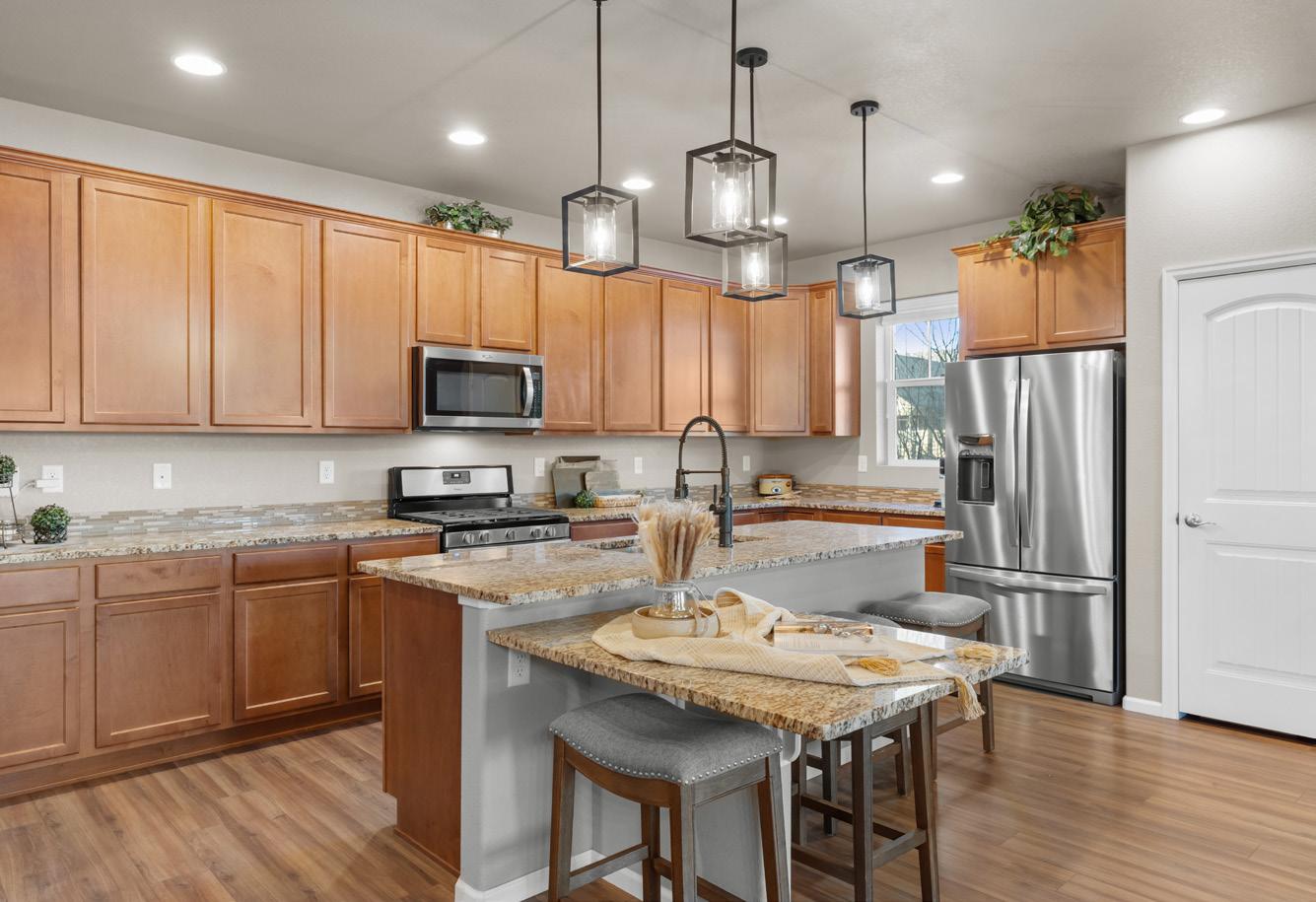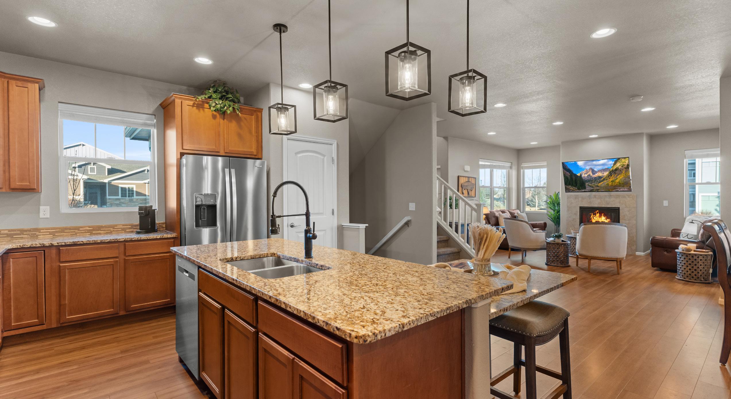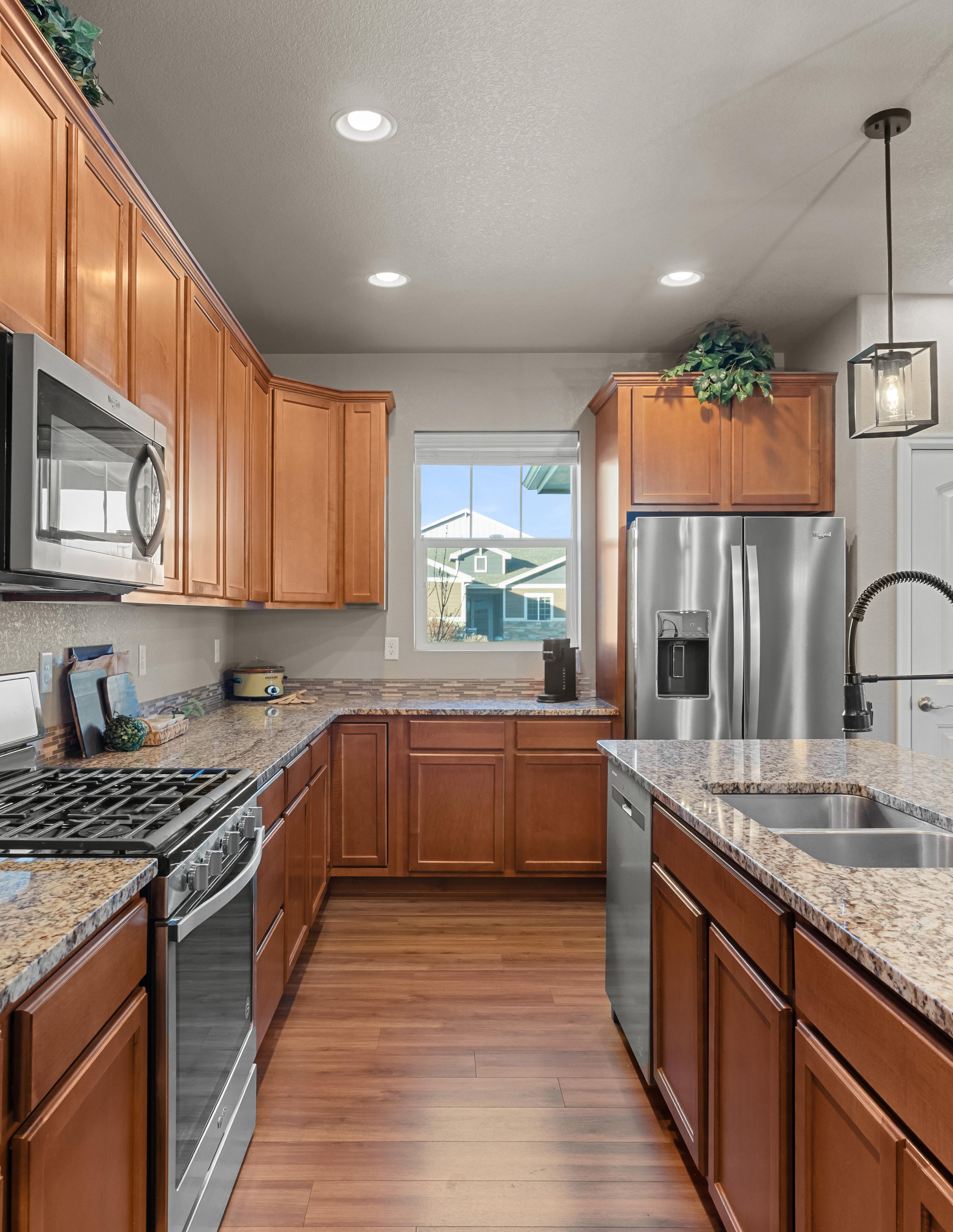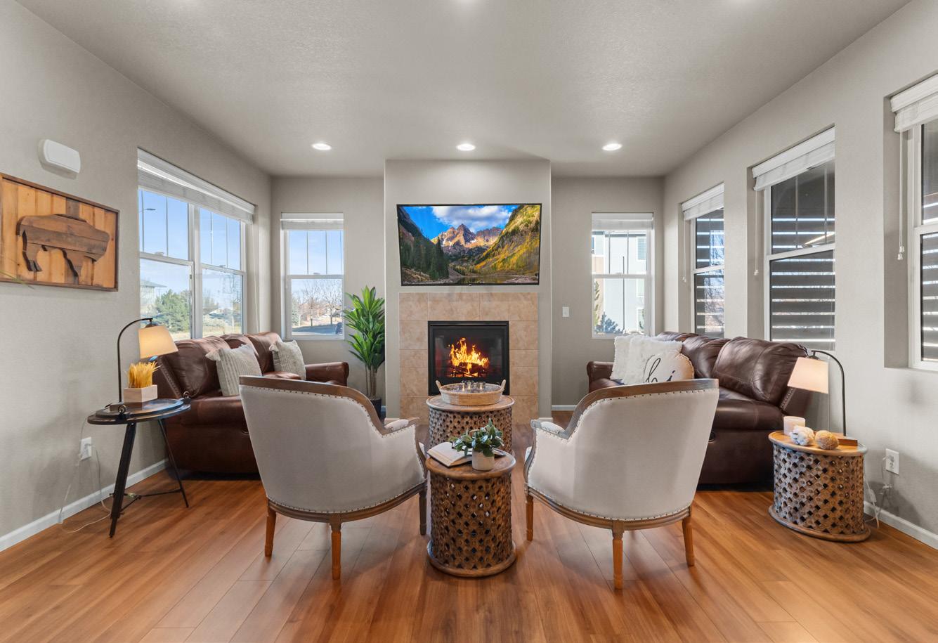 The open floor plan features a large kitchen with granite countertops, tons of cabinetry, and generous prep space, flowing into the living room with a cozy gas fireplace. The main level showcases LVP flooring and a welcoming covered front entry. Enjoy a fully fenced backyard and private enclosed back patio. Upstairs includes three bedrooms, a versatile loft, and a spacious primary suite with a 5-piece bath, vaulted ceilings, and walk-in closet. A 2-car garage adds convenience while situated nicely on a corner lot. Ideally centrally located near grocery stores, coffee shops, and biking trails. Truly a move-in ready home!