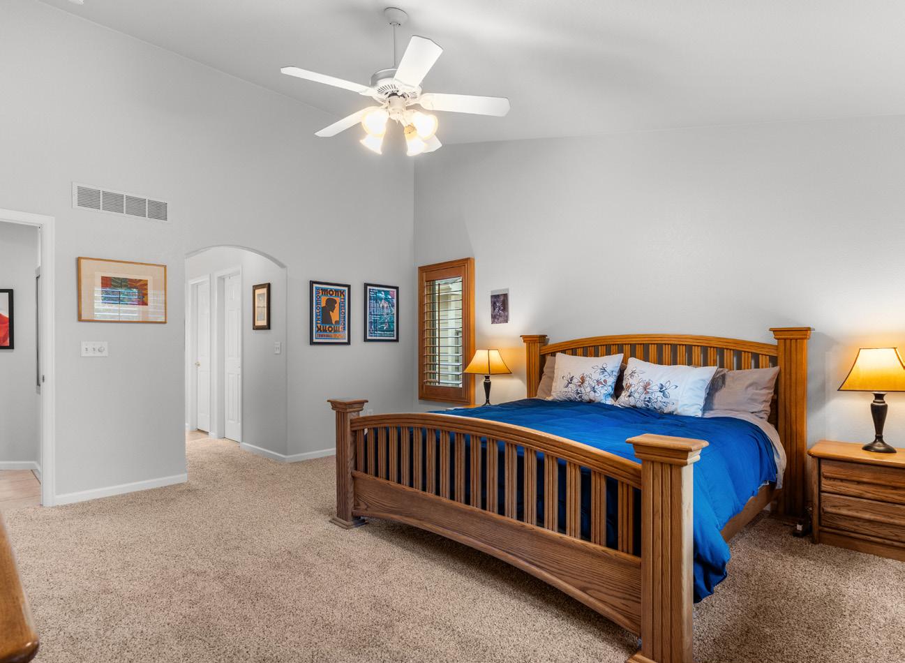 Inside, find a bright living room with large windows & plantation shutters, 3 sided stone fireplace shared with the spacious kitchen including pantry & tons of cabinet space!