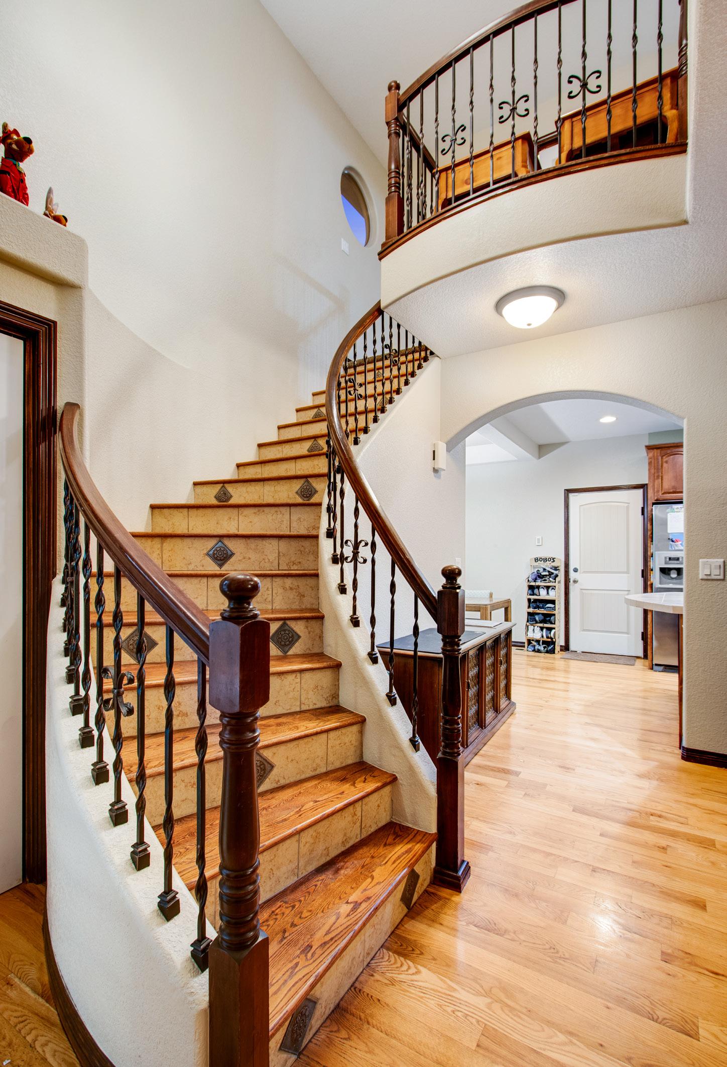 • Circular staircase with iron railing and decorative tile inlay under every step