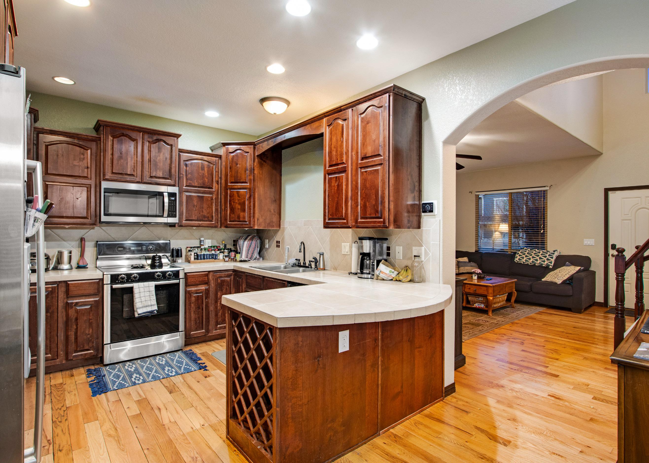 • Kitchen features stainless steel appliances which are all included, tile countertops and backsplash, lazy Susan, Cityscape knotty alder cabinets with crown molding and under mount lighting, plenty of can lights and a breakfast bar