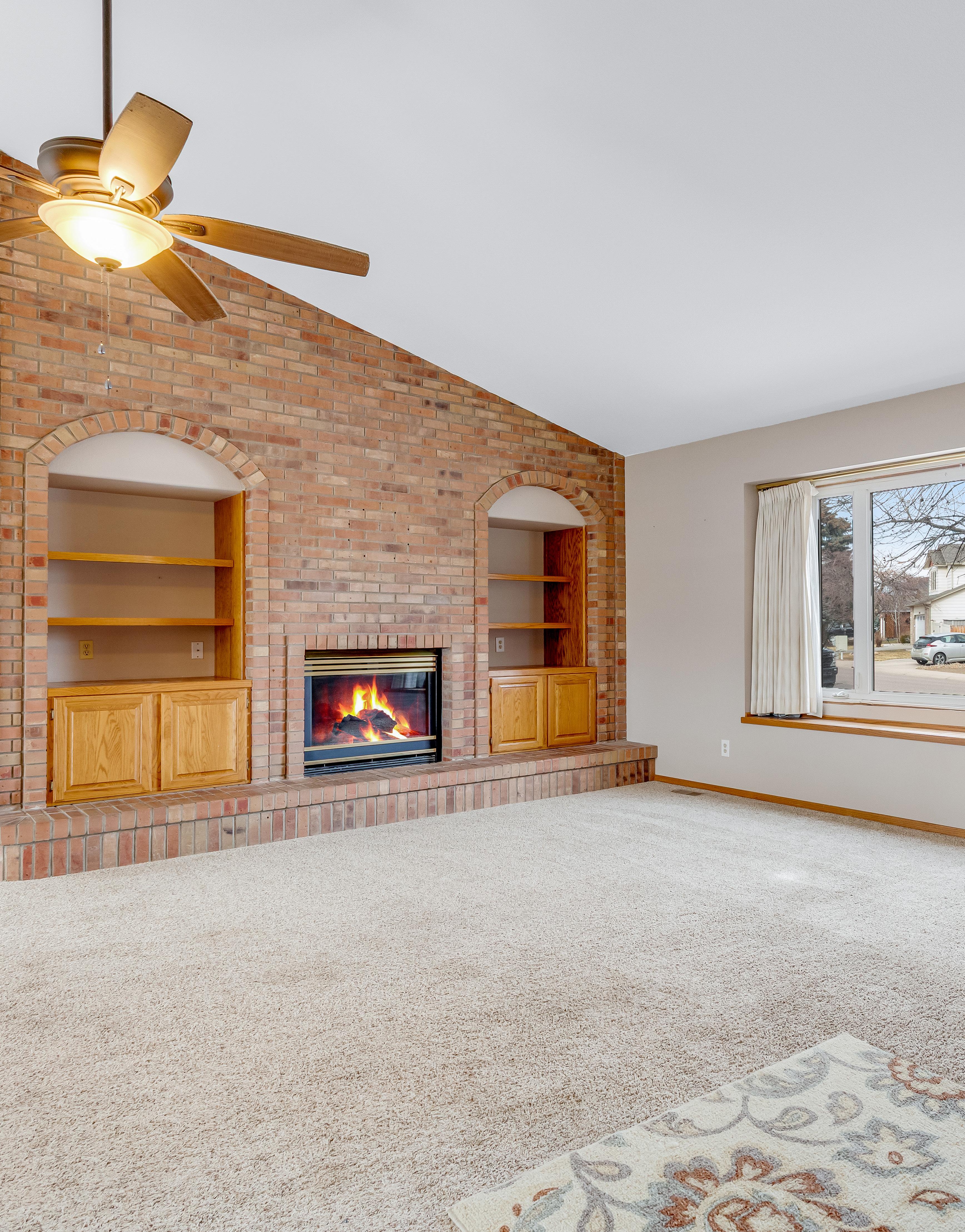 • Step down family room featuring vaulted ceilings, fan, gas fireplace with built-in cabinets, brick backsplash and blower for added heat