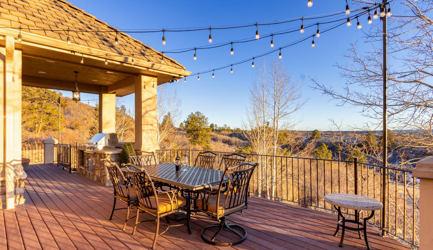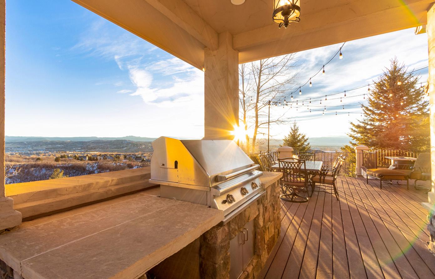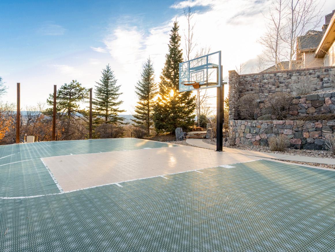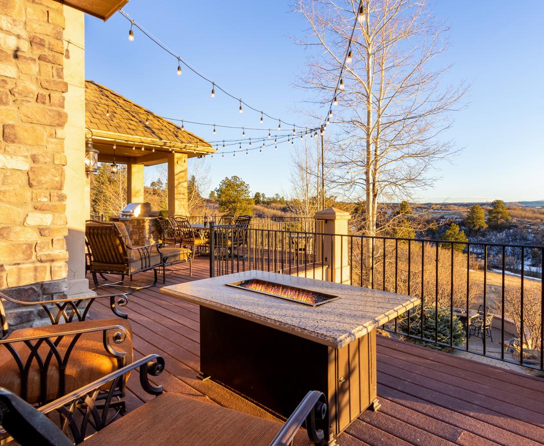 Situated on one acre backing to open space, the outdoor setting is designed to embrace Colorado’s natural beauty. A Trex deck with built-in BBQ, stamped concrete patios, and peaceful water features create inviting spaces for outdoor relaxation. The grounds also include a pickleball and basketball court, a gas firepit for evening gatherings, and tranquil landscaped surroundings that make the property ideal for both recreation and entertaining.