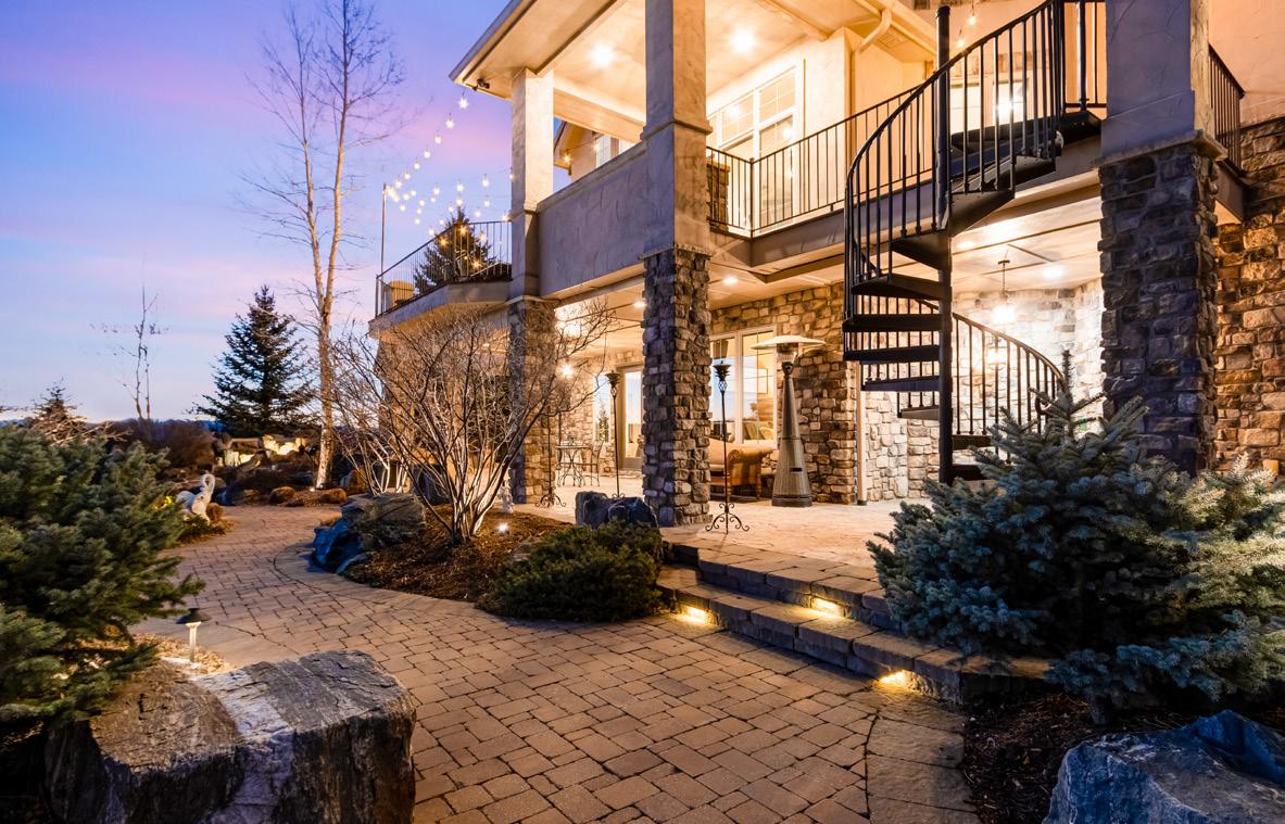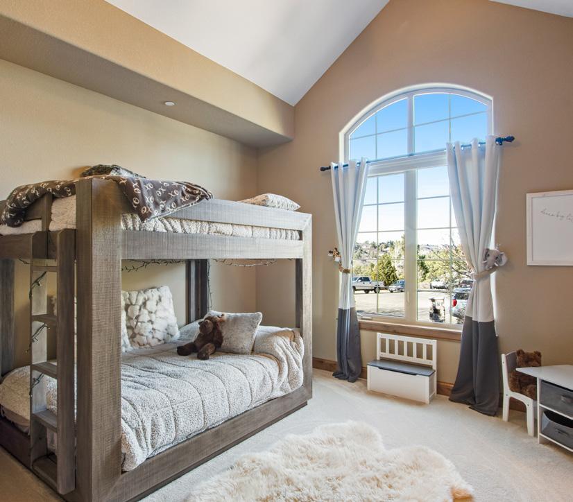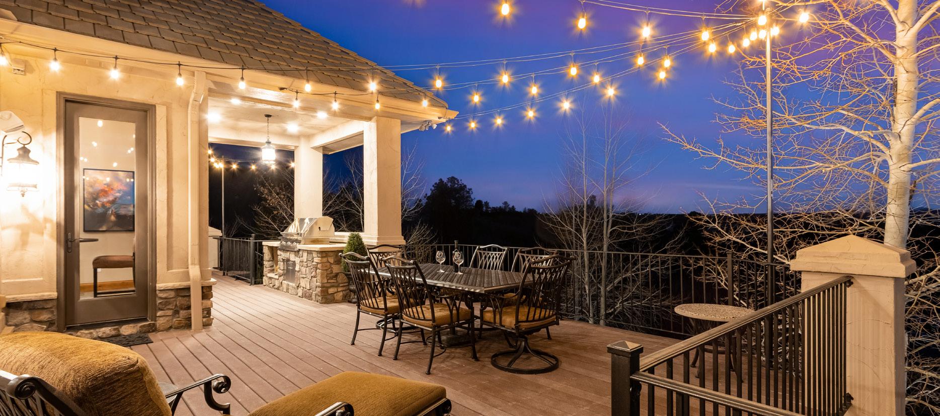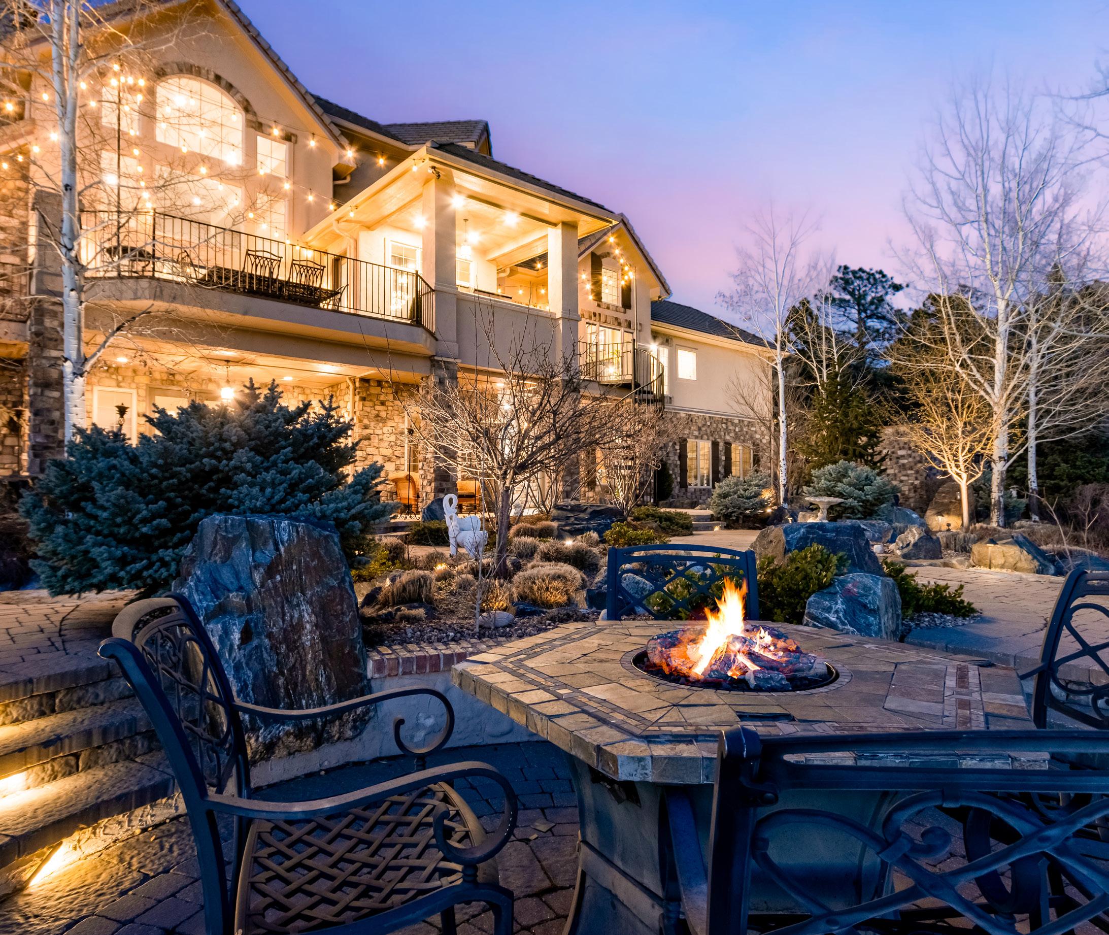 Situated on one acre backing to open space, the outdoor setting is designed to embrace Colorado’s natural beauty. A Trex deck with built-in BBQ, stamped concrete patios, and peaceful water features create inviting spaces for outdoor relaxation. The grounds also include a pickleball and basketball court, a gas firepit for evening gatherings, and tranquil landscaped surroundings that make the property ideal for both recreation and entertaining.