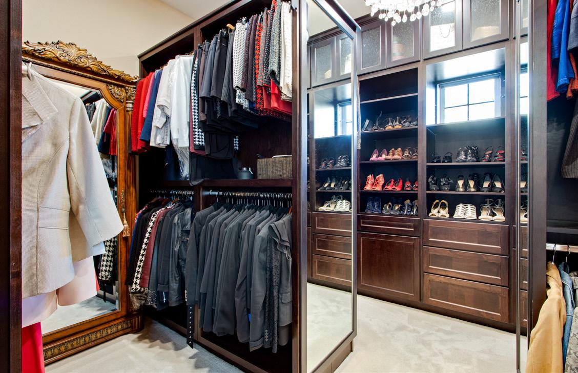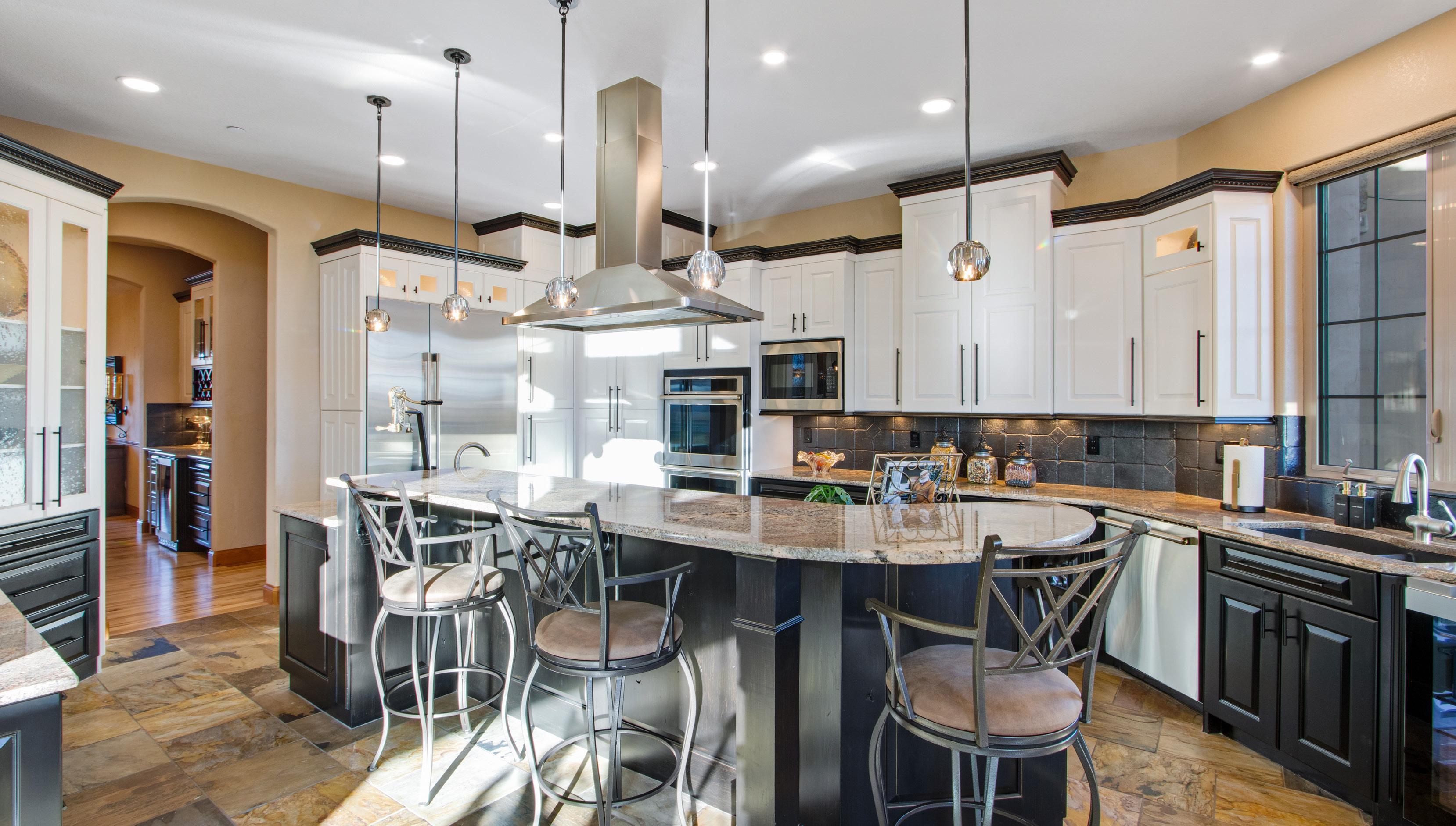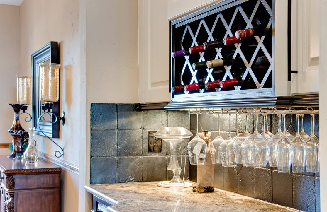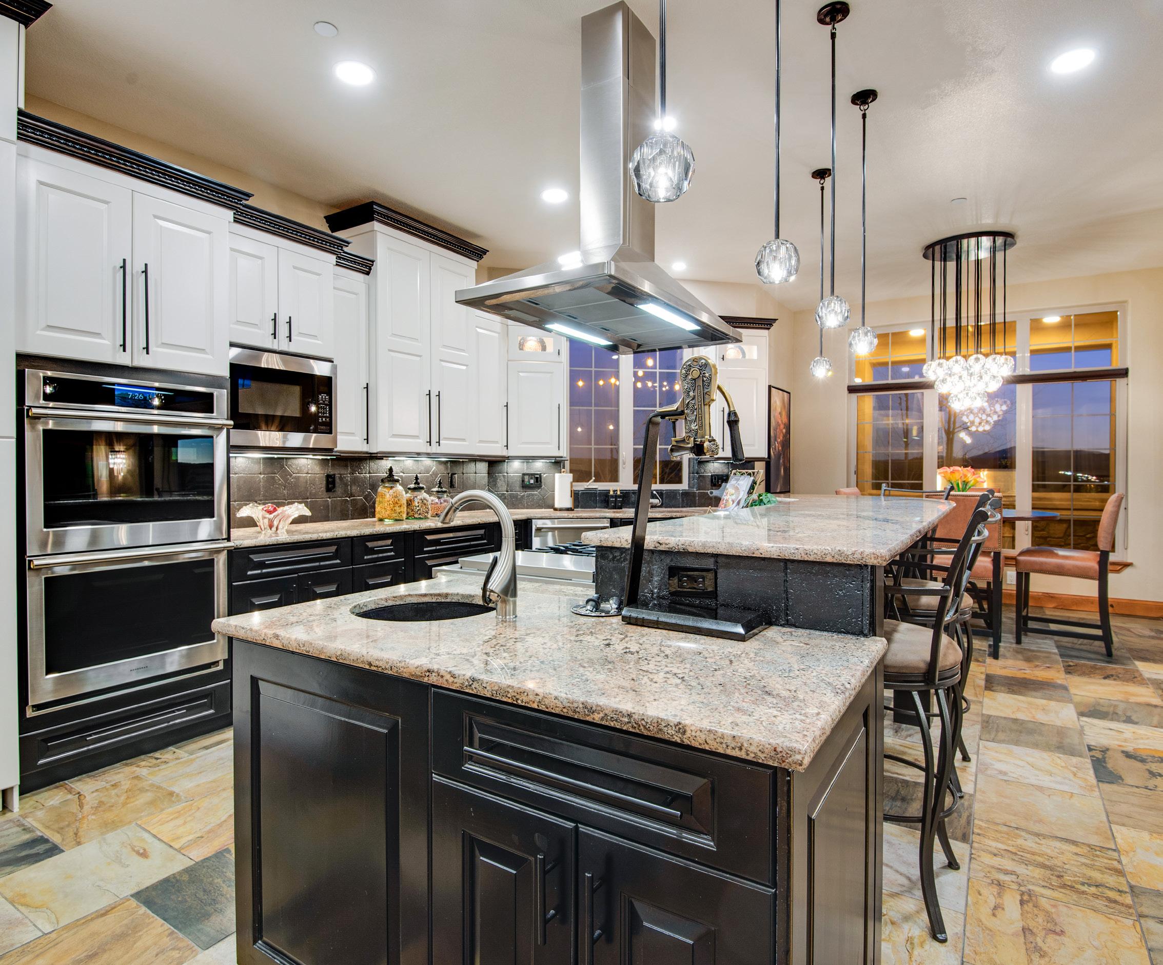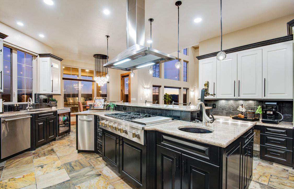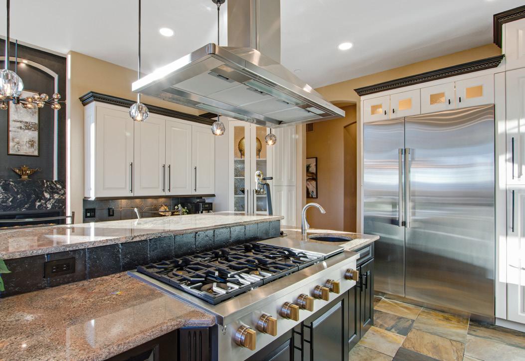 The gourmet kitchen blends beauty and functionality with a butler’s pantry, hidden walkin pantry, and a large island with breakfast bar. Granite countertops, tile backsplash, abundant cabinetry, and premium stainless appliances — including a six-burner gas range and double ovens — make this kitchen ideal for both everyday living and entertaining.