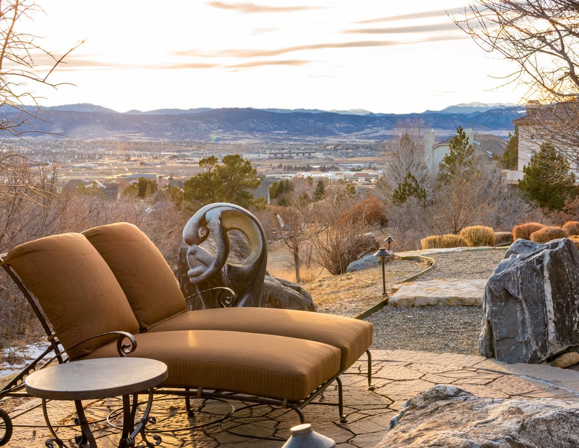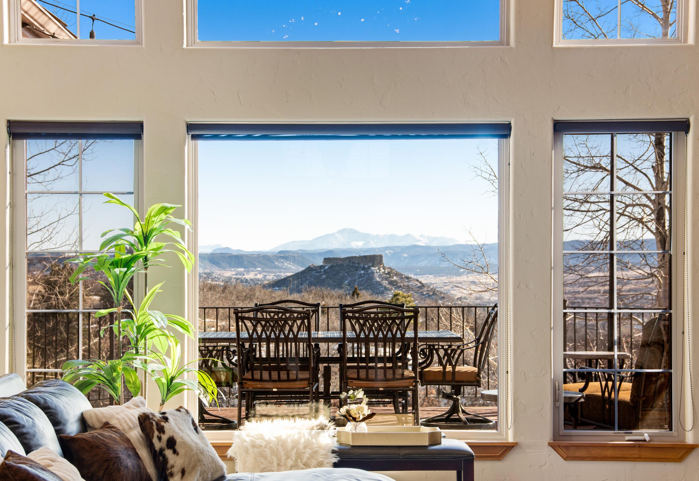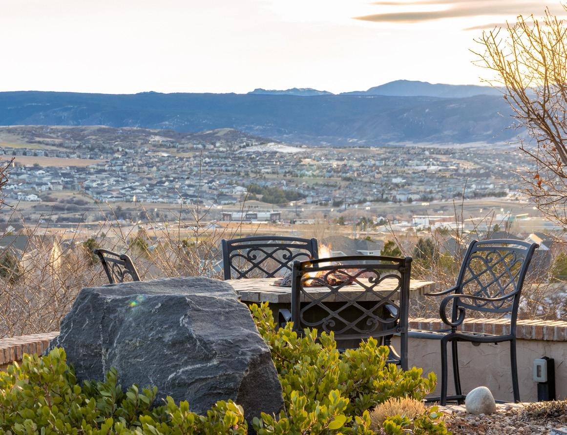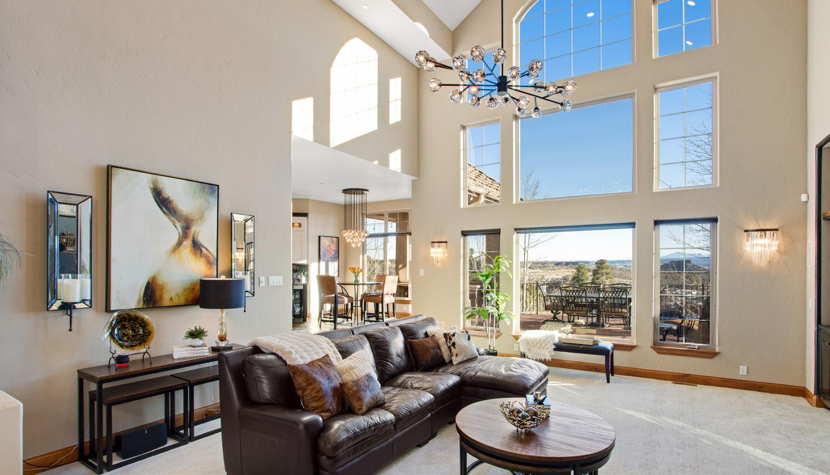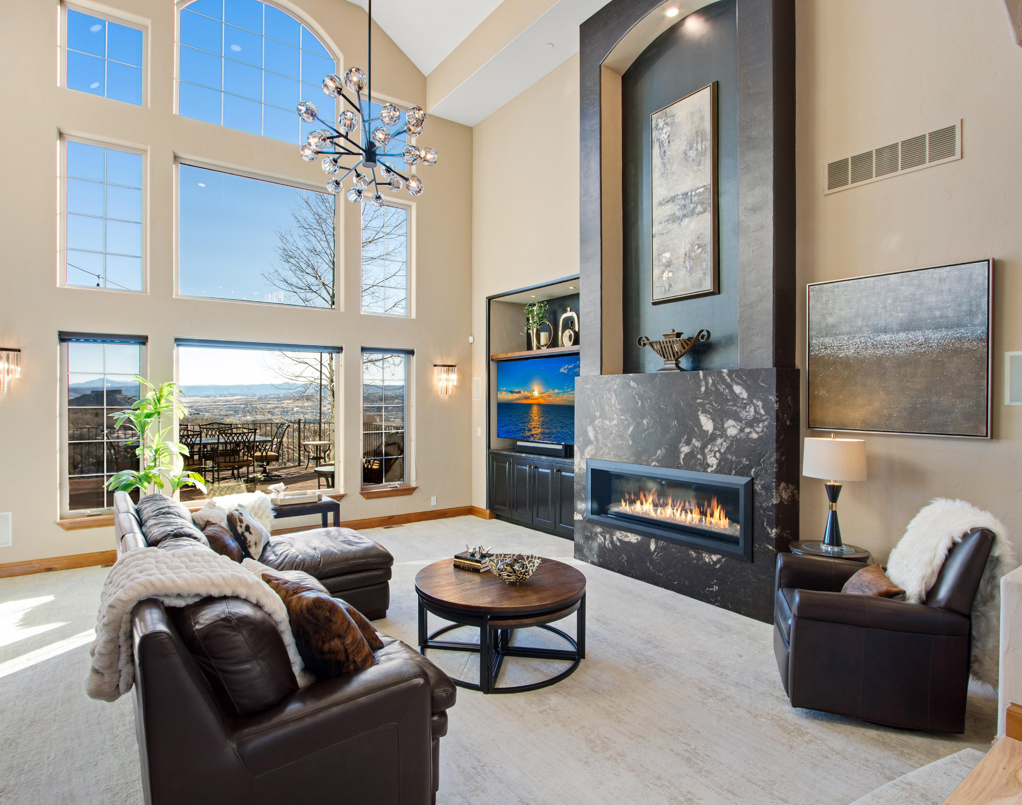 The breathtaking great room features soaring 20-foot ceilings, a striking granite fireplace, and expansive walls of windows that frame stunning views of Castle Rock Mountain and Pikes Peak.