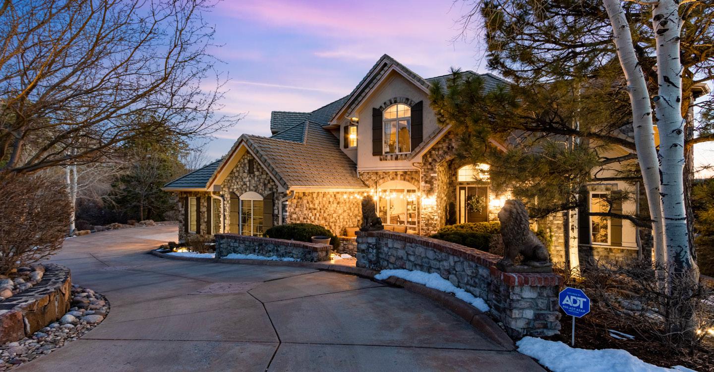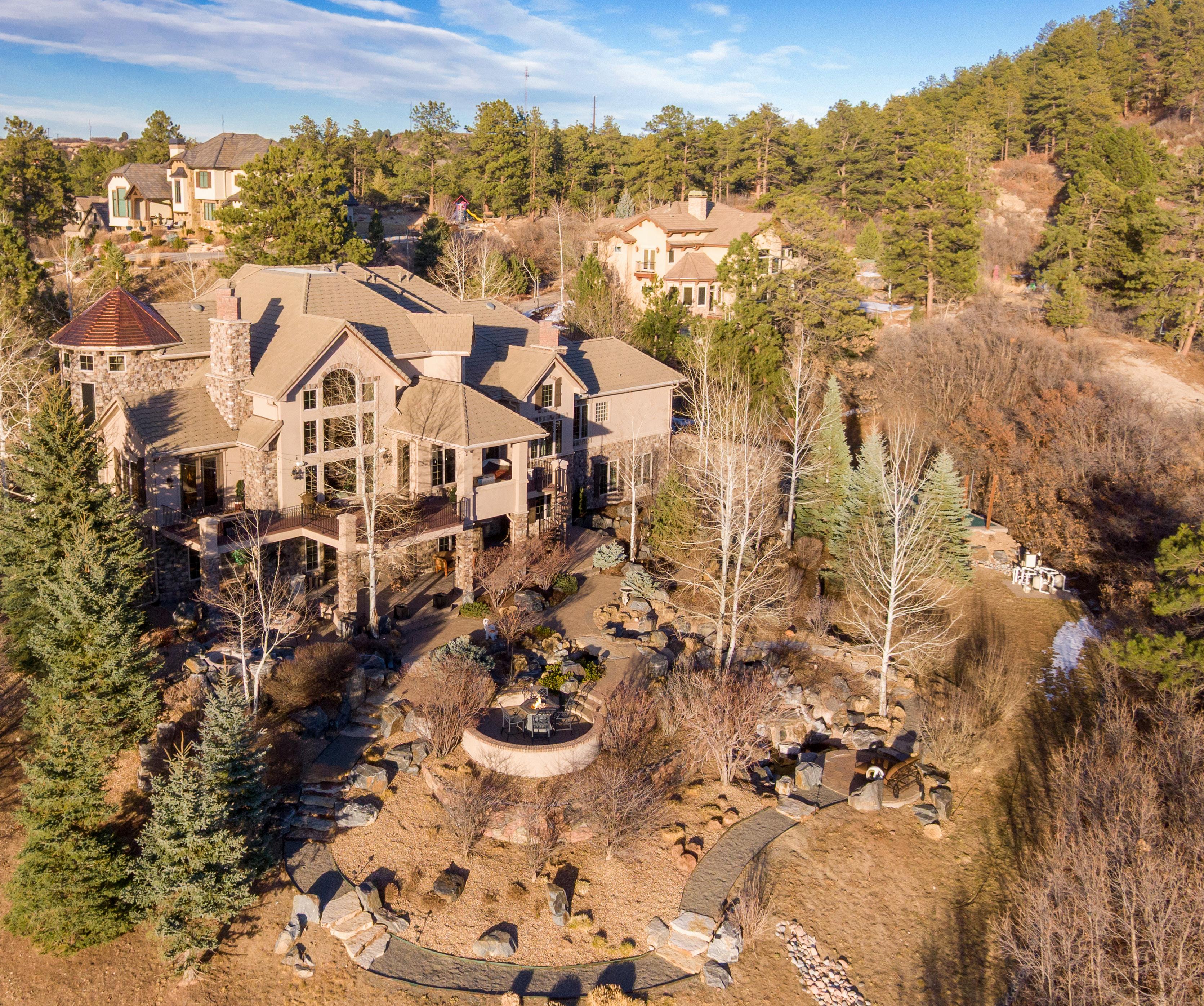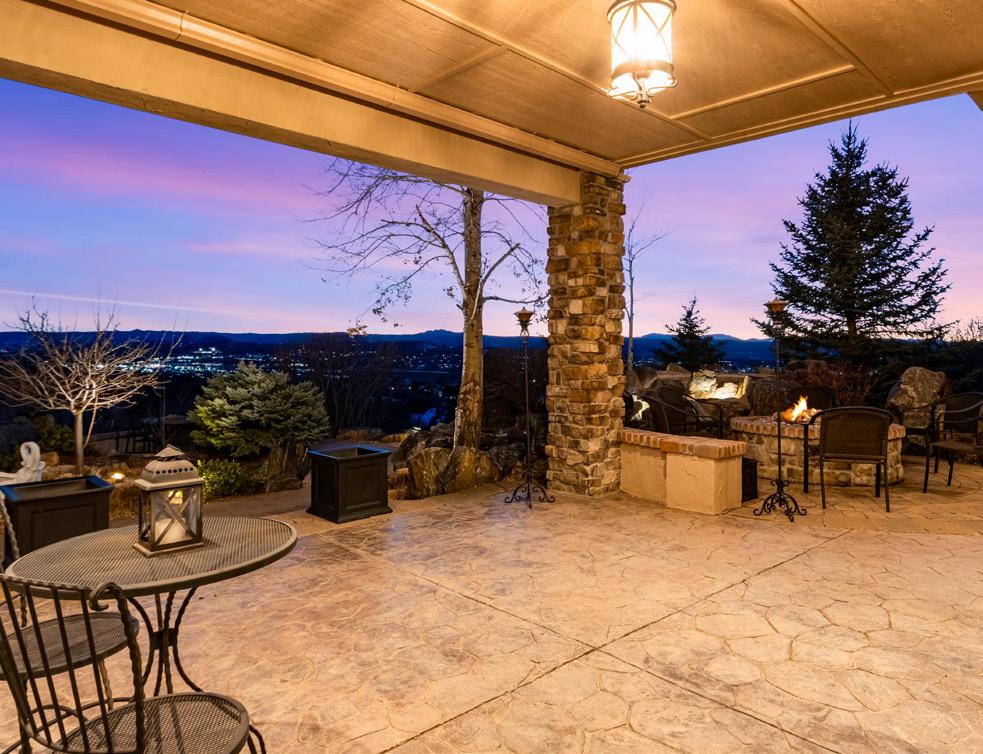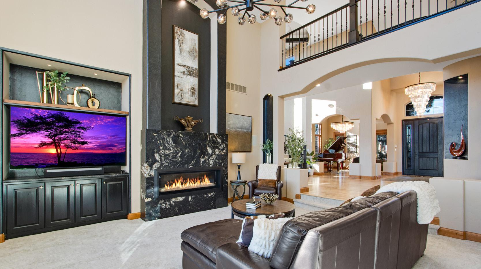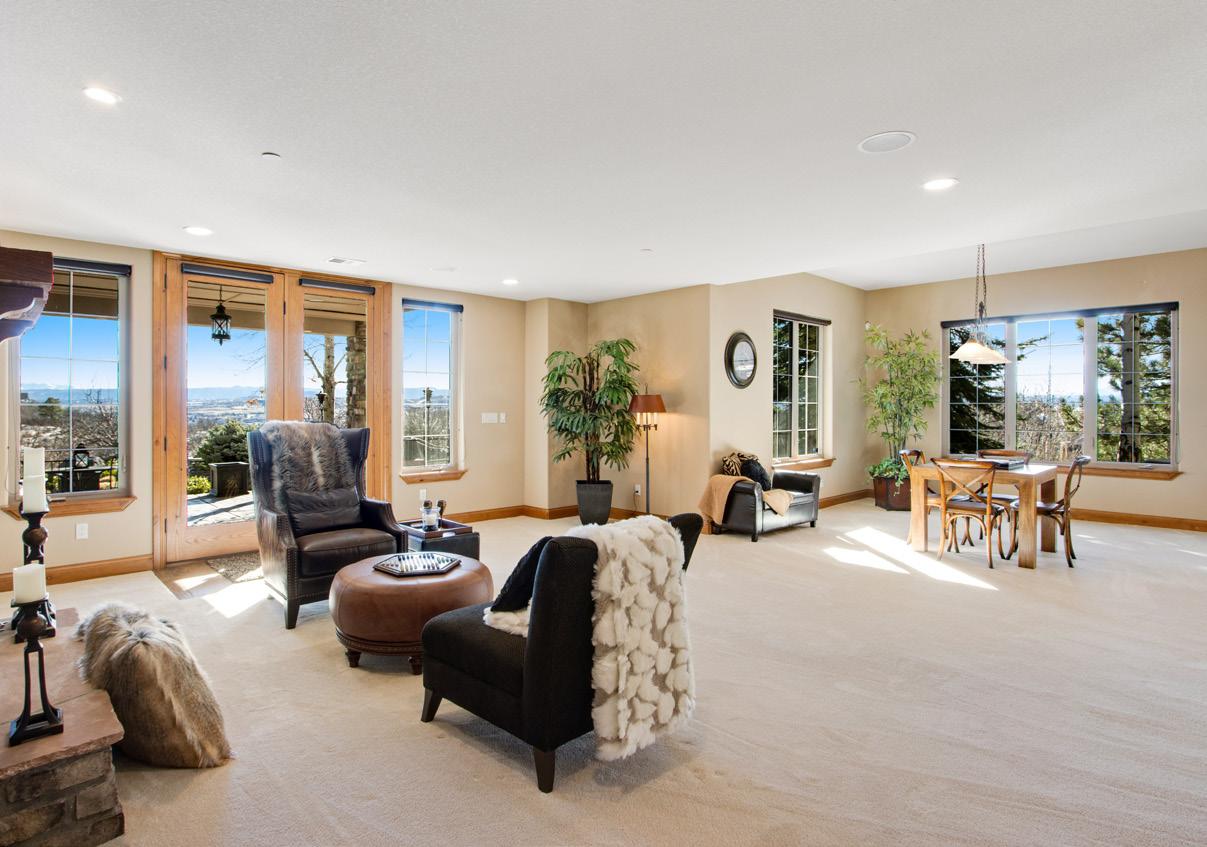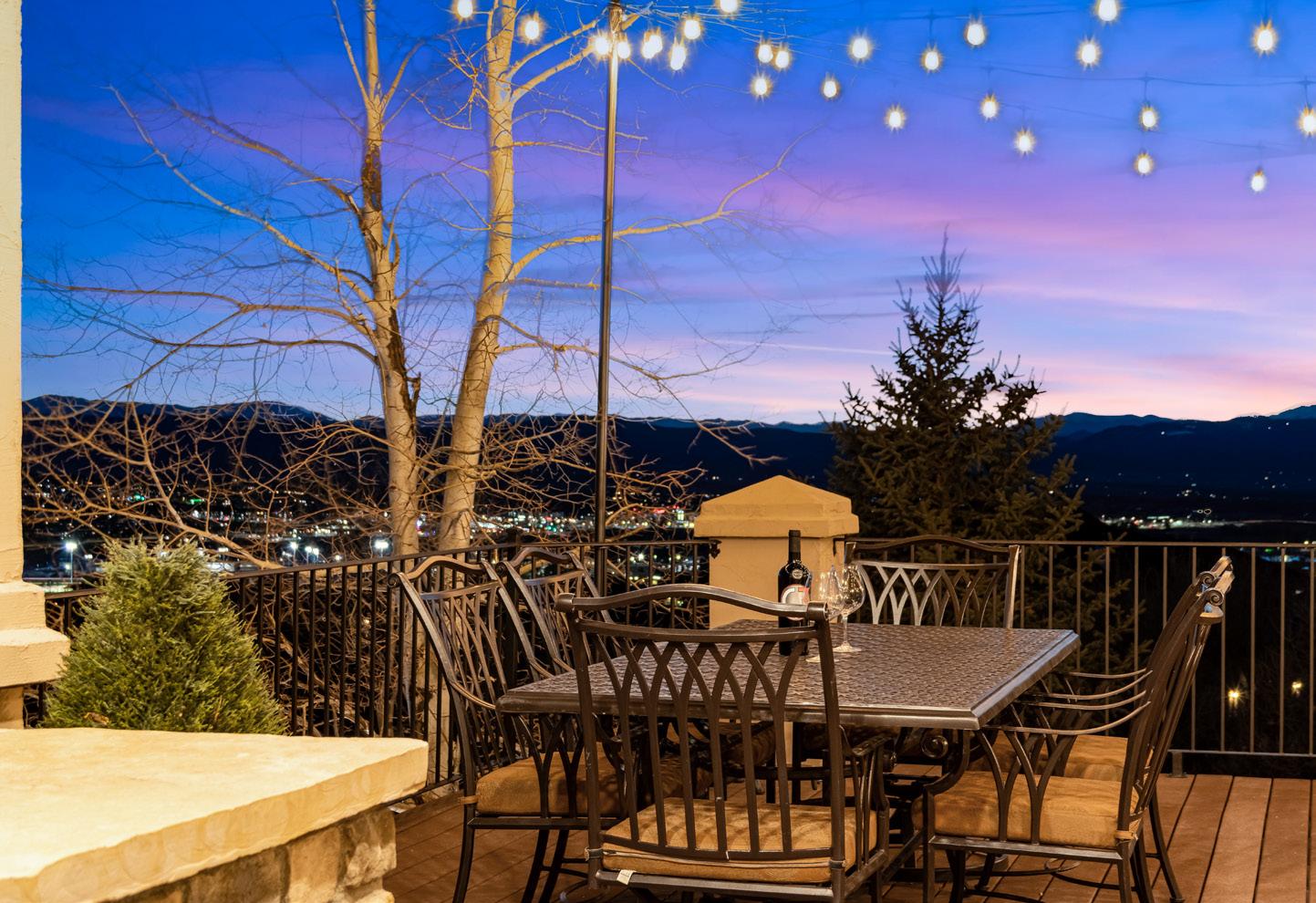 The breathtaking great room features soaring 20-foot ceilings, a striking granite fireplace, and expansive walls of windows that frame stunning views of Castle Rock Mountain and Pikes Peak.