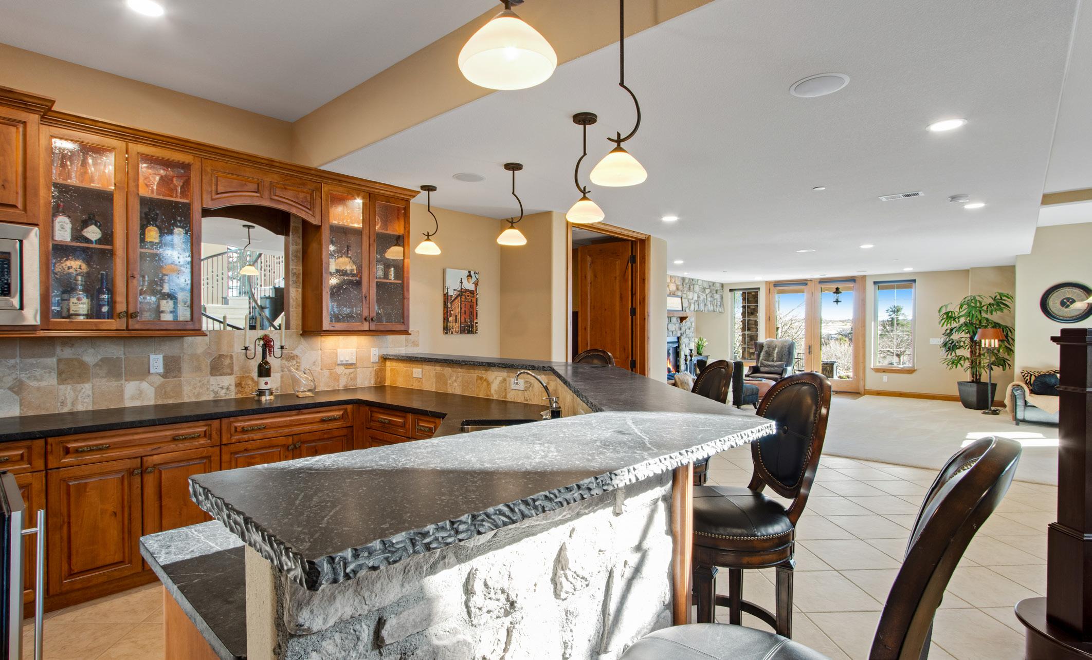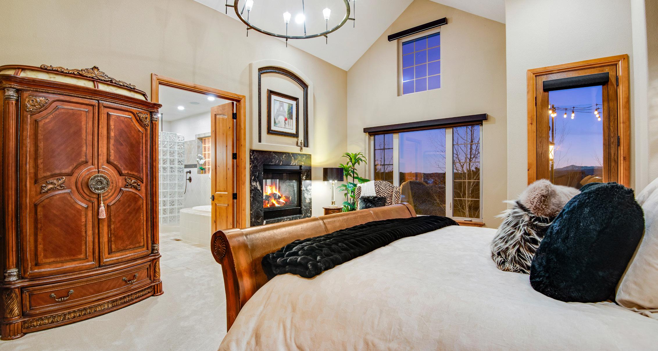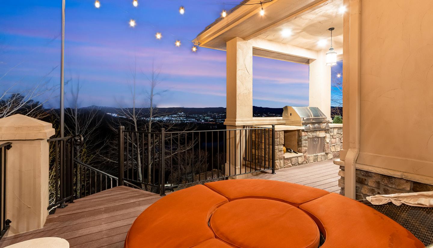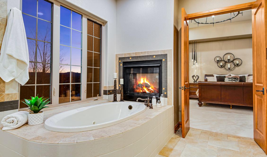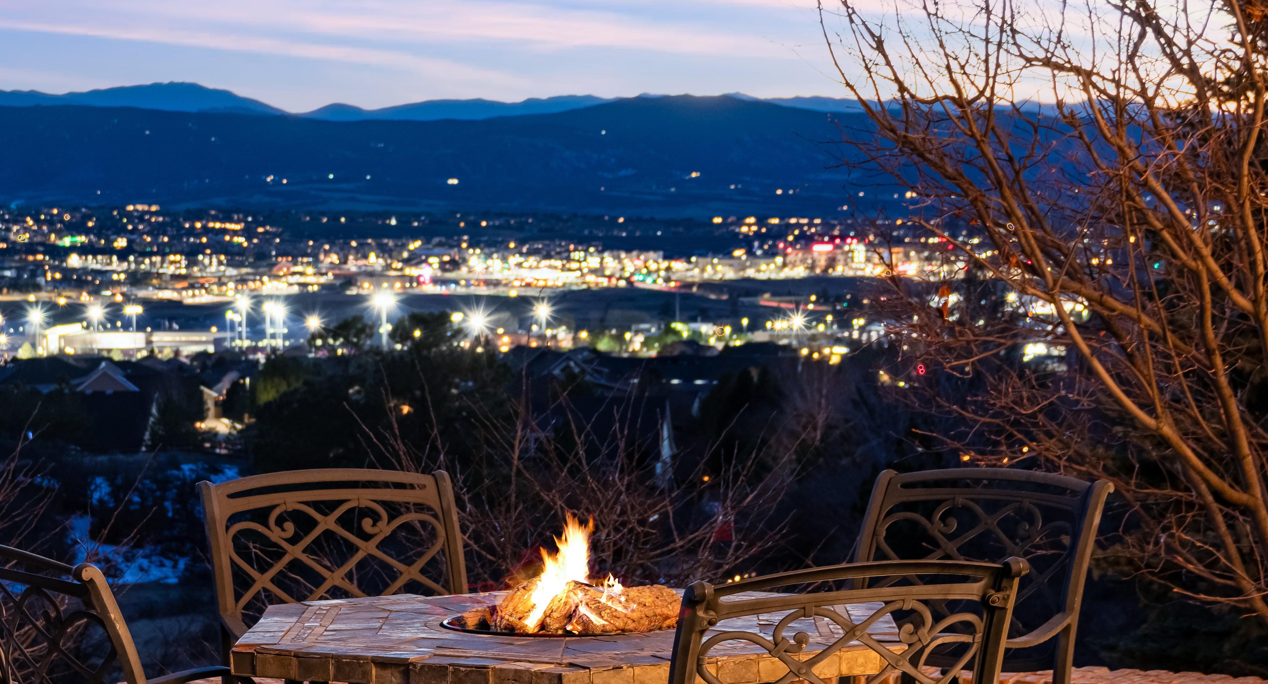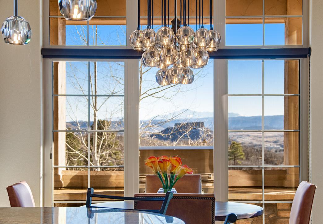 The breathtaking great room features soaring 20-foot ceilings, a striking granite fireplace, and expansive walls of windows that frame stunning views of Castle Rock Mountain and Pikes Peak.