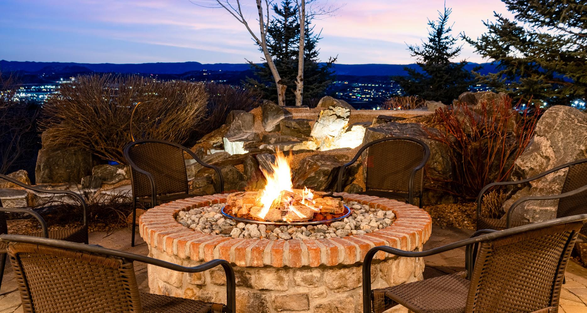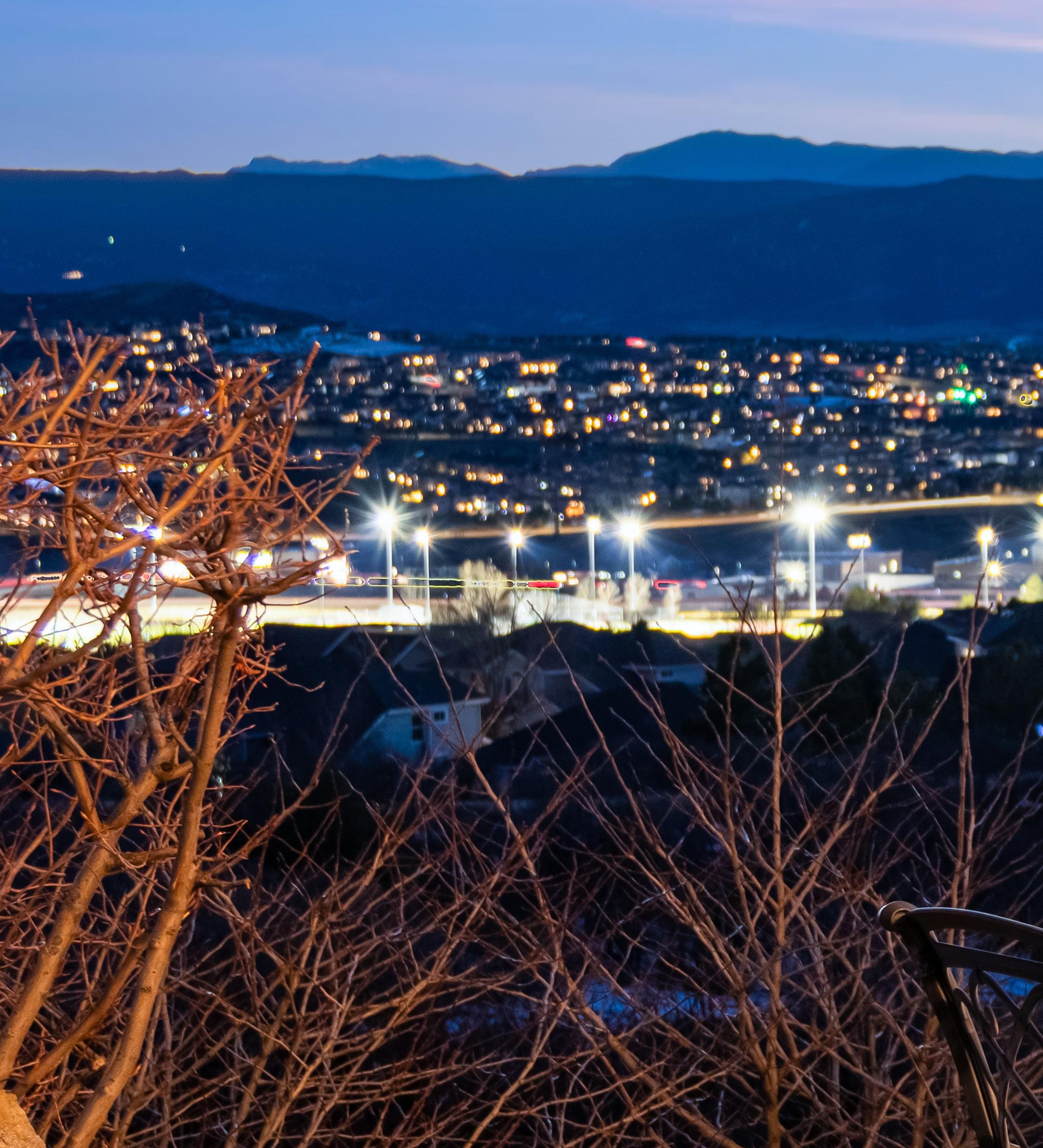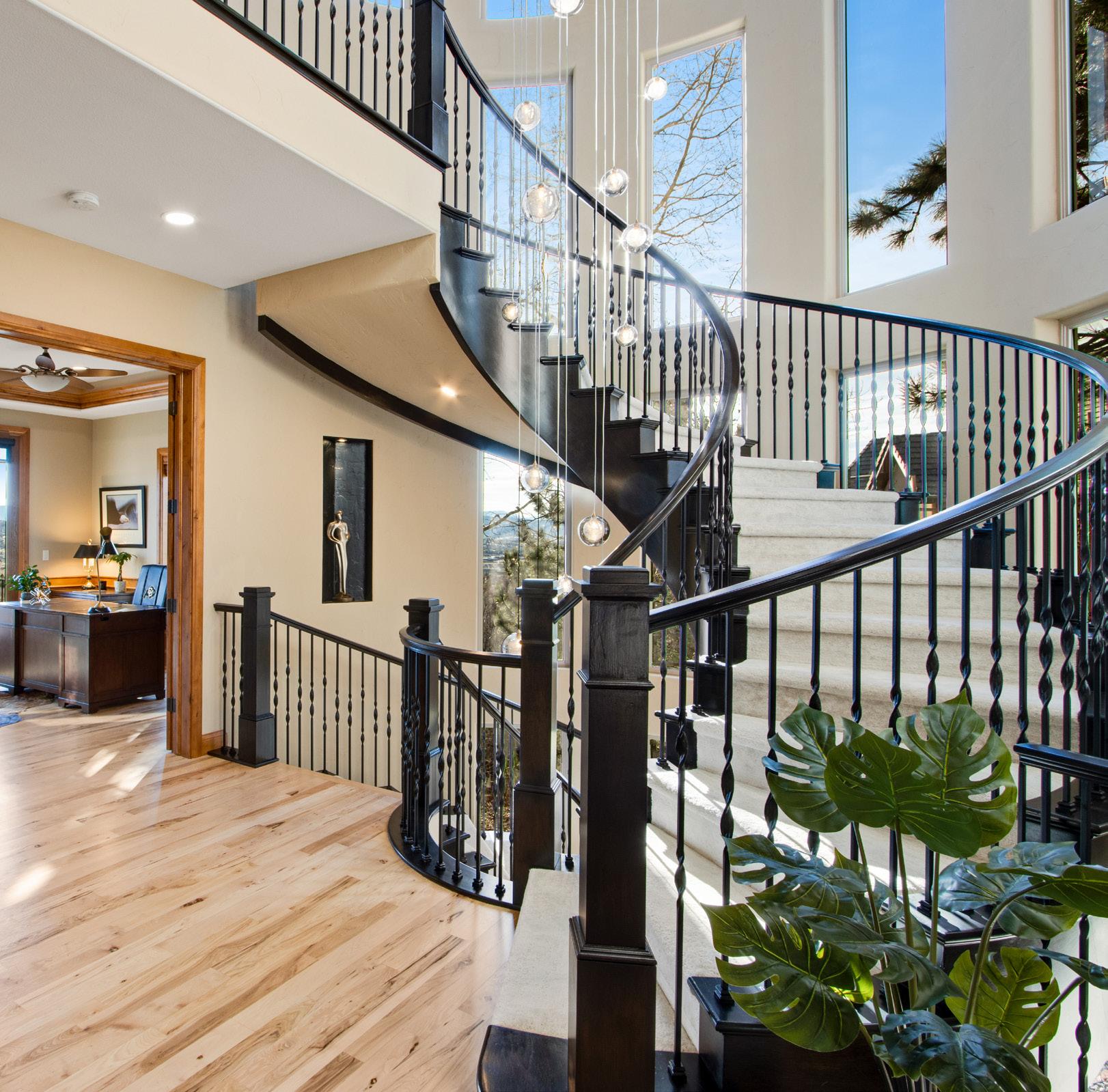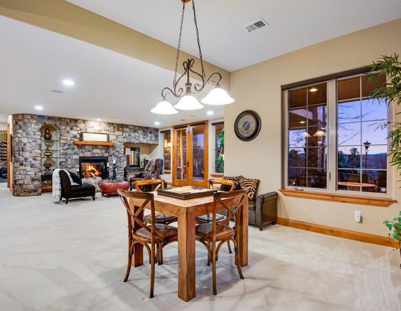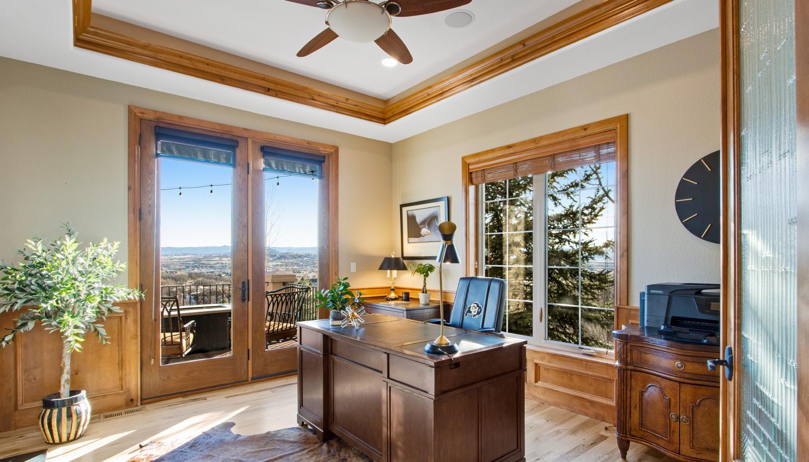 The breathtaking great room features soaring 20-foot ceilings, a striking granite fireplace, and expansive walls of windows that frame stunning views of Castle Rock Mountain and Pikes Peak.
