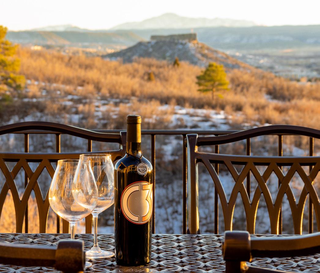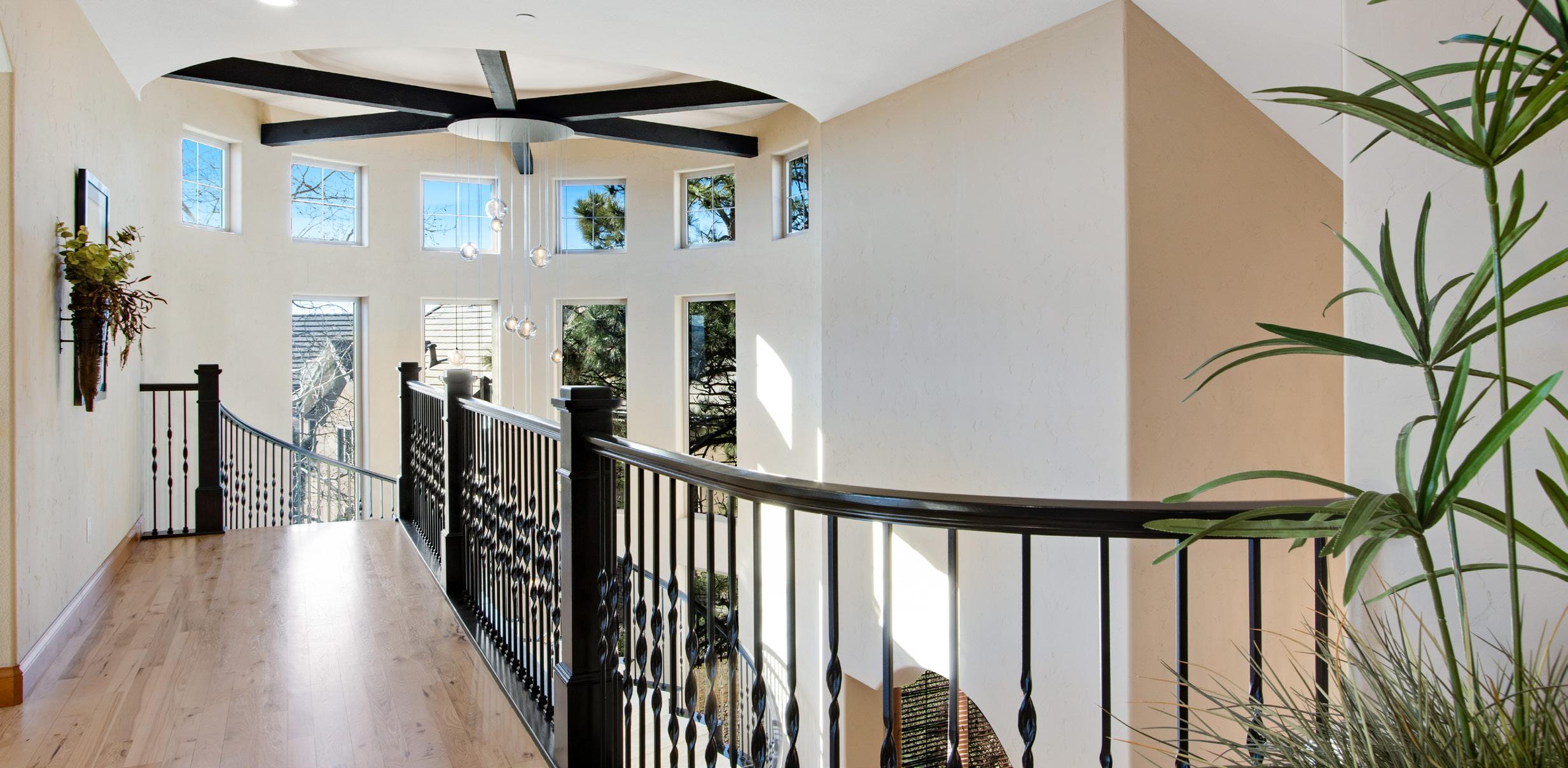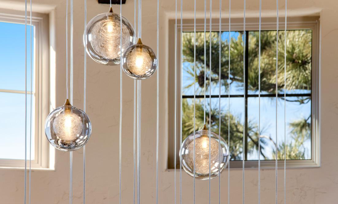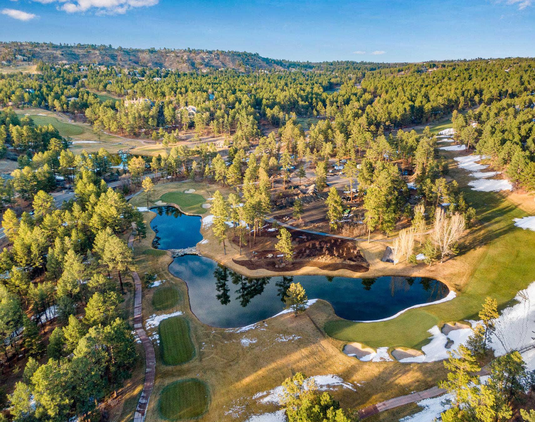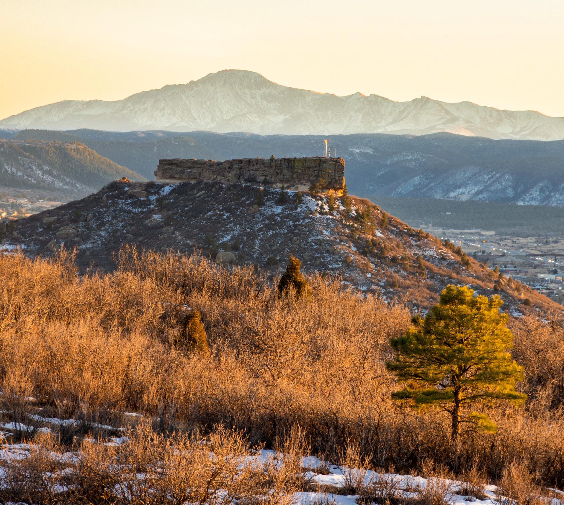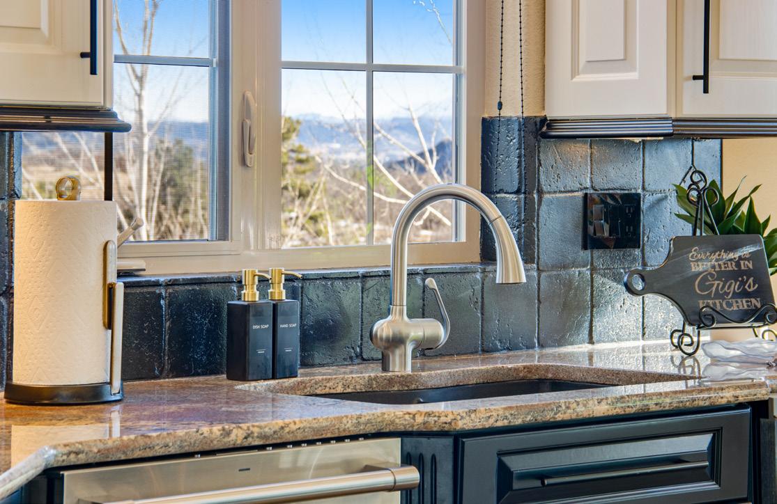 The breathtaking great room features soaring 20-foot ceilings, a striking granite fireplace, and expansive walls of windows that frame stunning views of Castle Rock Mountain and Pikes Peak.