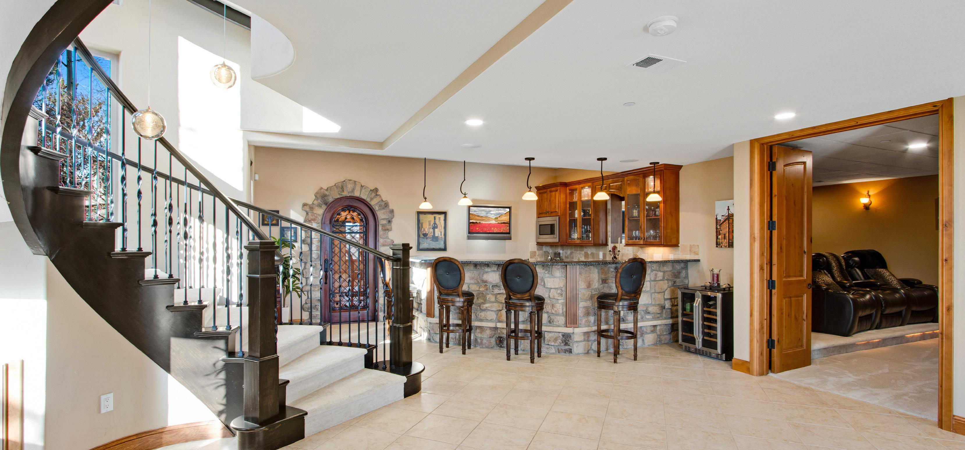 The lower level also features a wet bar, wine cellar, guest suites, and a steam shower — creating a private retreat ideal for entertaining and extended guest stays.