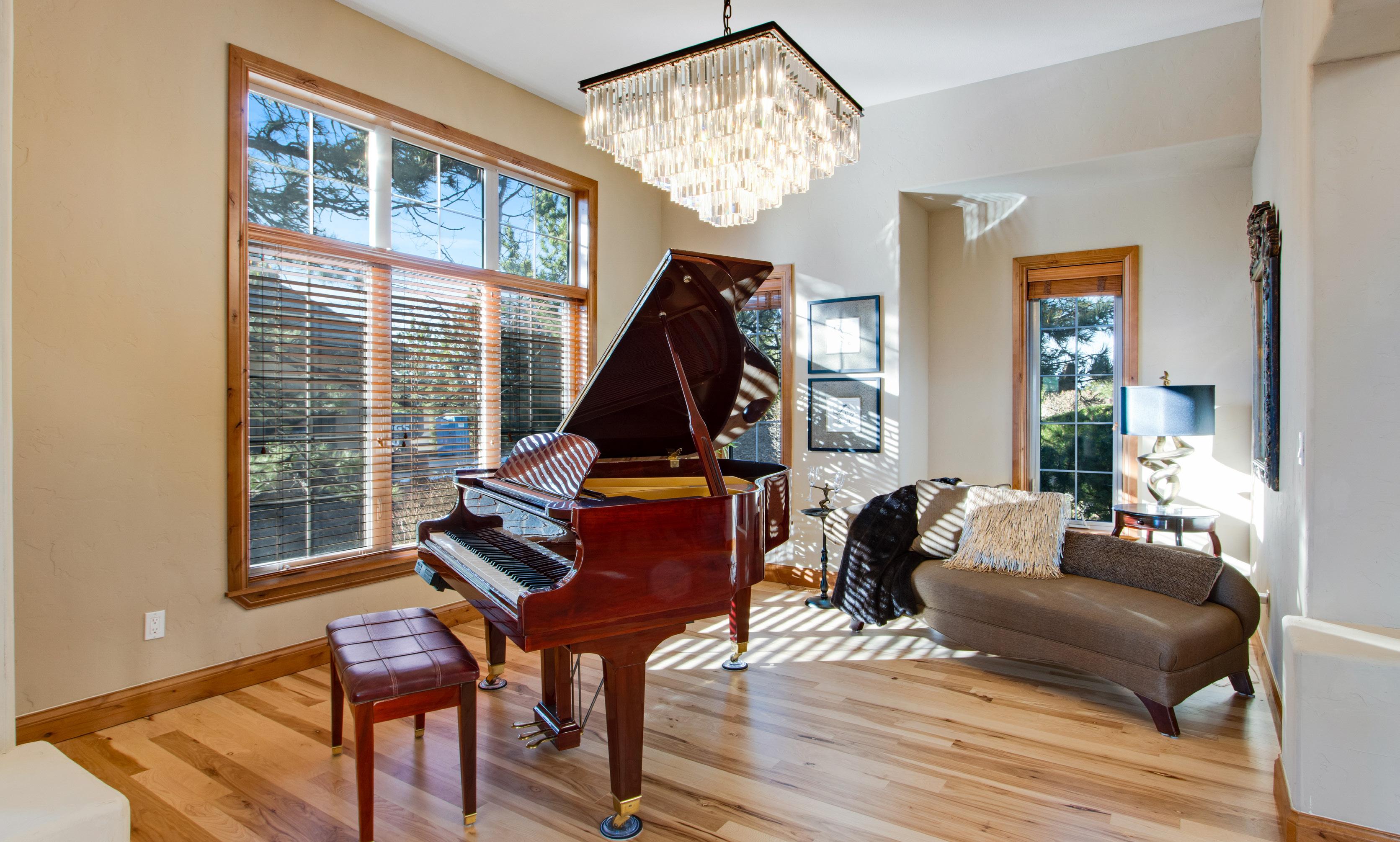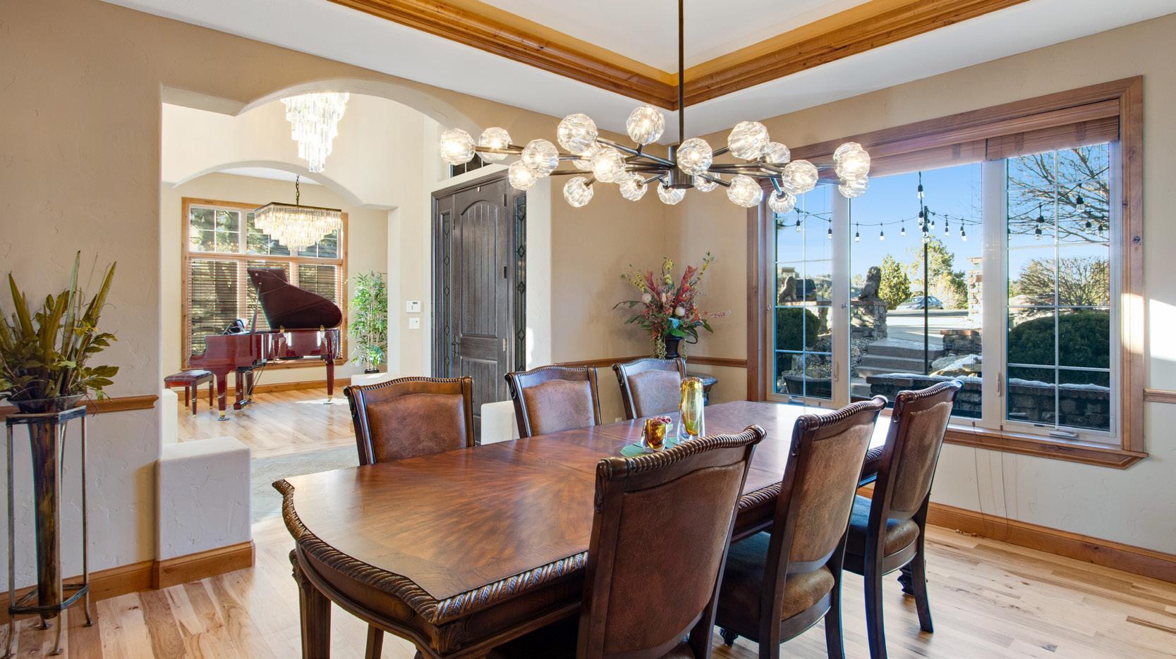 Elegant formal dining and piano rooms create refined spaces for entertaining and celebration. Just beyond, French doors open to a private office complete with a gas fireplace — the perfect setting for work, reading, or quiet retreat.