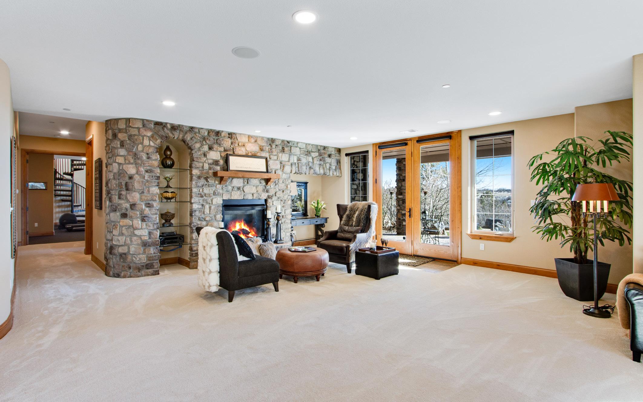 The walk-out basement offers impressive 10-foot ceilings and expansive recreation spaces including a theater room, billiard area, and a comfortable family room with stone fireplace.